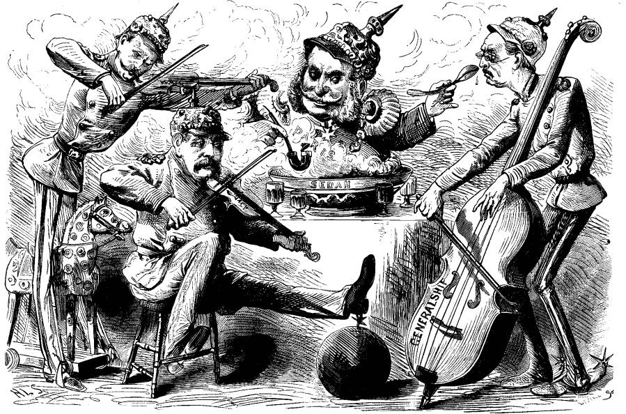 THE MODERN "OLD KING COLE." He called for his pipe and he called for his bowl,And he called for his Fiddlers three, Von BISMARK, Von MOLKIE and Von ROON, For a merry old monarch was he. HIRAM GREEN TO H. WARD BEECHER. The "Lait Gustice's" Advice to the Brooklyn Divine. SKEENSBORO, Nye onto Varmont. MY KLERGICAL FRIEND—Feelin it my duty to encourage a man when he strikes the rite gait, I seize the goose-quil to set down and scratch off a letter to you. I've heard you preach, and, to do the square thing, I am constrained to say you've got talents into you, on which to bild a first-class Dominy. My advice is, to let your talents sintilate; don't undertake to hide 'em under a bushel of peanuts. Let 'em blaze, friend B.—let 'em blaze. I dident notiss any bill-boards hangin about your mouth, savin as how "Rooms was to let in your sky-lofts;" but contrary wise, it's my opinion there haint a tenement house in New York which is packed fuller of people than your figger-head is of slap-up idees. You haint afeard to stand out baldly and face the sea of upturned red maskaline noses, or hily-frizzled, gorgeously-got-up femilines, and skatter Fiseology rite and left, not carin a pickaune who's hit or who haint. A man who scores up as you do, is bound to win in the long run, if he only keeps his eyes about him, and don't undertake to go it blind. Yoove got a futer ahead of you bigger'n a meetin-house. Keep ploddin along in the evening tender of your way, and I predict you'l ocupy a front rank among the clergy. I, the lait Gustise, which has served his country for 4 yeer as Gustise of the Peece, tells you so; and havin asshiated with a good many big guns in my day, my profetic vision is as clear as Rine wine. You haint much like a preacher I once useter sleep under. We called him OLD CLOROFORM. His sermons were dredful soothin to take. Old Mother WINSLOW couldent play 2nd fiddle to his preachin, and her sirop is better'n a club to put children to sleep. Why, friend BEECHER, that ere minnister was warranted to talk a squallin young one to sleep in 30 seconds. When our Doctors had a leg to saw off, they always sent for Dominy CLOROFORM to put the patient to sleep. He dident preach "Rest for the weary" without practisin what he preached, by makin his weary congregation rest like kittens. But the old man has been scooped in, and our drug store has gone up on cloroform. His last words were:— "Sweet sleepers, I go. I'le drug no more." And beneath the mirtle, the Canada thistle, and the gooseberry-bush he rests, with the follerin epitaff on his tombstun:— Hee's