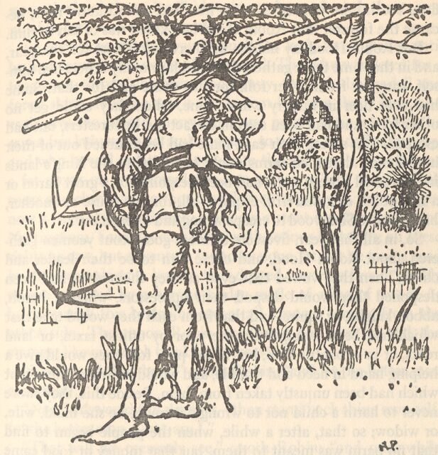 It was well for Robin Hood that that same forester's head was spinning with ale, or else he would never have taken another step. As it was, the arrow whistled within three inches of his head. Then he turned around and quickly drew his own bow, and sent an arrow back in return.