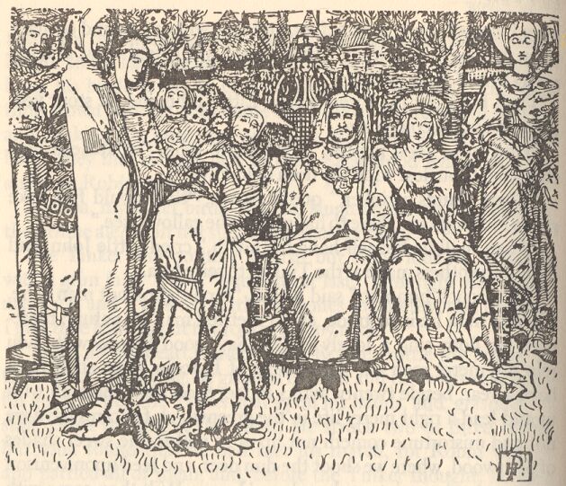 "It may not be," said merry Robin. "I am king here, and no subject may raise hand against the king. But even our great King Richard may yield to the holy Pope without shame, and even take a tap from him by way of penance; therefore I will yield myself to this holy friar, who seemeth to be one in authority, and will take my punishment from him." Thus saying, he turned to the King, "I prythee, brother, wilt thou take my punishing into thy holy hands?"