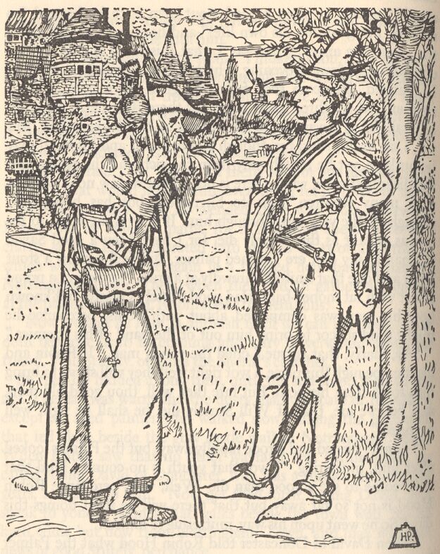 So saying, he strode away through the leafy forest glades until he had come to the verge of Sherwood. There he wandered for a long time, through highway and byway, through dingly dell and forest skirts. Now he met a fair buxom lass in a shady lane, and each gave the other a merry word and passed their way; now he saw a fair lady upon an ambling pad, to whom he doffed his cap, and who bowed sedately in return to the fair youth; now he saw a fat monk on a pannier-laden ass; now a gallant knight, with spear and shield and armor that flashed brightly in the sunlight; now a page clad in crimson; and now a stout burgher from good Nottingham Town, pacing along with serious footsteps; all these sights he saw, but adventure found he none. At last he took a road by the forest skirts, a bypath that dipped toward a broad, pebbly stream spanned by a narrow bridge made of a log of wood. As he drew nigh this bridge he saw a tall stranger coming from the other side. Thereupon Robin quickened his pace, as did the stranger likewise, each thinking to cross first.