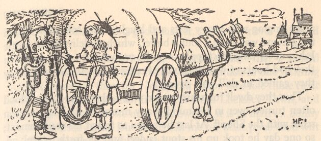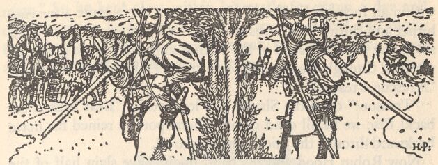 As thus he walked along with a brisk step and a merry whistle, he came suddenly upon some foresters seated beneath a great oak tree. Fifteen there were in all, making themselves merry with feasting and drinking as they sat around a huge pasty, to which each man helped himself, thrusting his hands into the pie, and washing down that which they ate with great horns of ale which they drew all foaming from a barrel that stood nigh. Each man was clad in Lincoln green, and a fine show they made, seated upon the sward beneath that fair, spreading tree. Then one of them, with his mouth full, called out to Robin, "Hulloa, where goest thou, little lad, with thy one-penny bow and thy farthing shafts?"