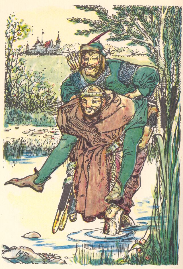 "Why, marry," answered jolly Robin, "yon stout fellow hath tumbled me neck and crop into the water and hath given me a drubbing beside."