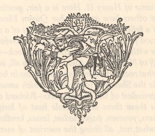 But without a word they all ran upon him at once, seizing him by his legs and arms and holding him tightly in spite of his struggles, and they bore him forth while all stood around to see the sport. Then one came forward who had been chosen to play the priest because he had a bald crown, and in his hand he carried a brimming pot of ale. "Now, who bringeth this babe?" asked he right soberly.