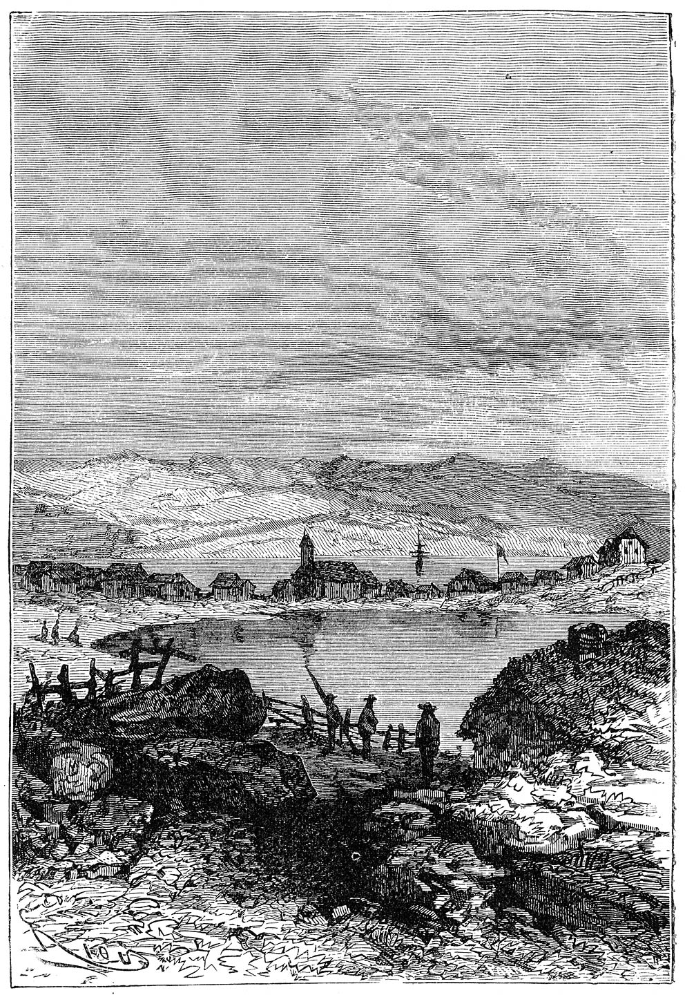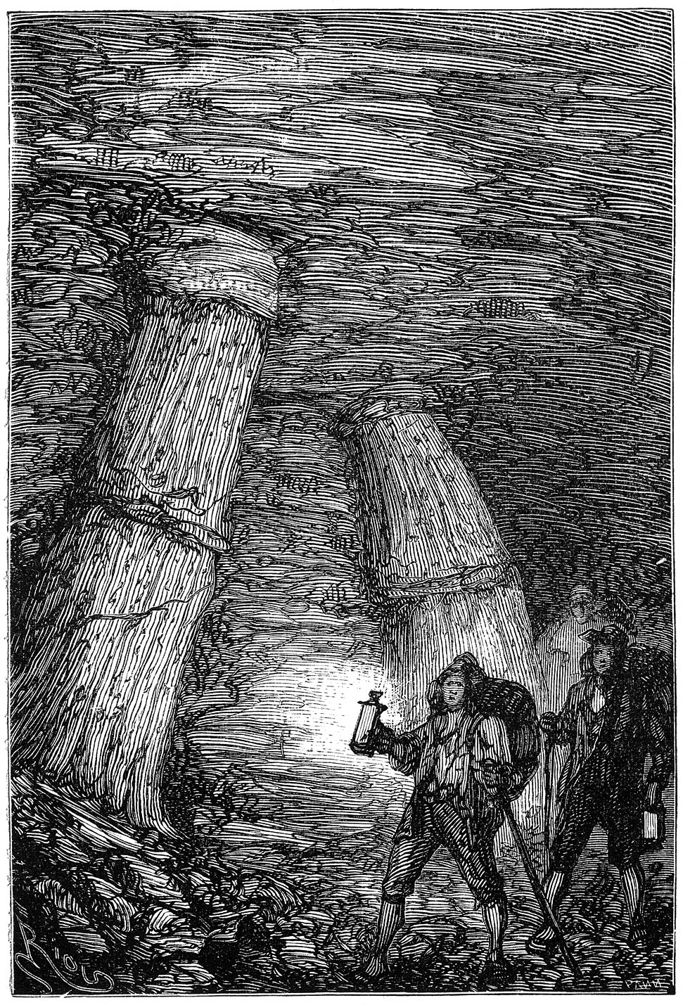 „De runen,” hernam hij, „waren schrijfletters, die vroeger op IJsland in gebruik waren, en volgens de overlevering had Odin zelf ze uitgevonden. Goddelooze! bezie en bewonder dan toch die teekens, welke uit het brein van een god zijn voortgekomen!”