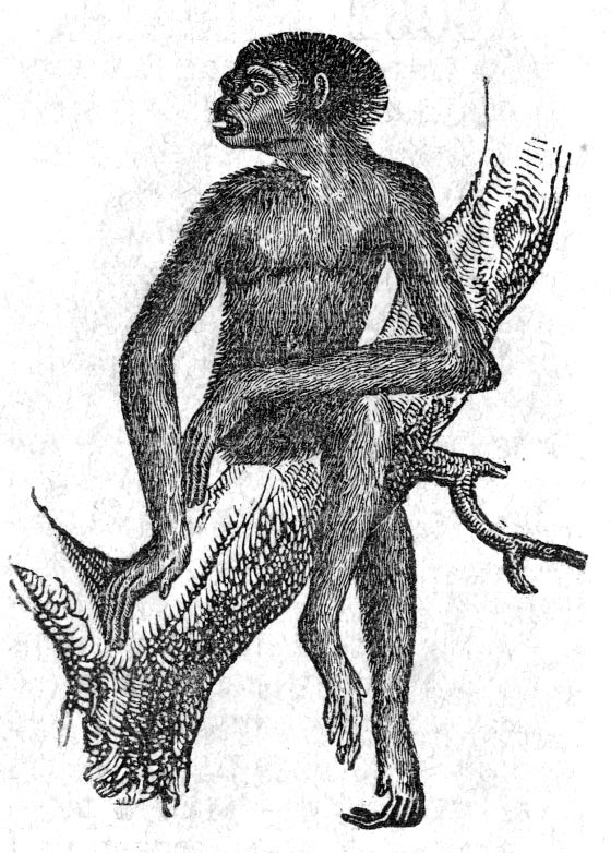 The Ourang Outang is a species of the ape; it has long arms and hands, with very long fingers. It is much larger than the ape, and some have been found about six feet high, when standing erect. It is capable of walking nearly erect; but the usual gait on the ground is like a cripple who supports himself on his hands, and draws his body forward. Its home, like the monkey family, seems to be on the trees. The hair is of a brownish red color, and covers his back, arms, legs, and the outside of his hands and feet. The face has no hair except whiskers on its side. He inhabits Malacca, Cochin China, and particularly the island of Borneo.