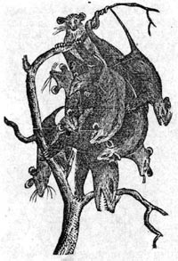 The Opossum is an American animal, having a head like the fox, and large eyes. The head is mostly white, and the body is covered with long black-and-white hairs. He climbs up trees with great facility, hides himself in the leaves to catch birds, or hangs himself by the tail from a branch. It seeks its food in the night, and lives on fruit, insects, and birds' eggs. Its teeth are fifty in number. The most remarkable circumstance in the natural history of this animal is the pouch which is formed under the belly of the female, in which it carries its young ones when they are small. If the little creatures are frightened when absent from their mother, they scamper to this asylum as soon as possible.