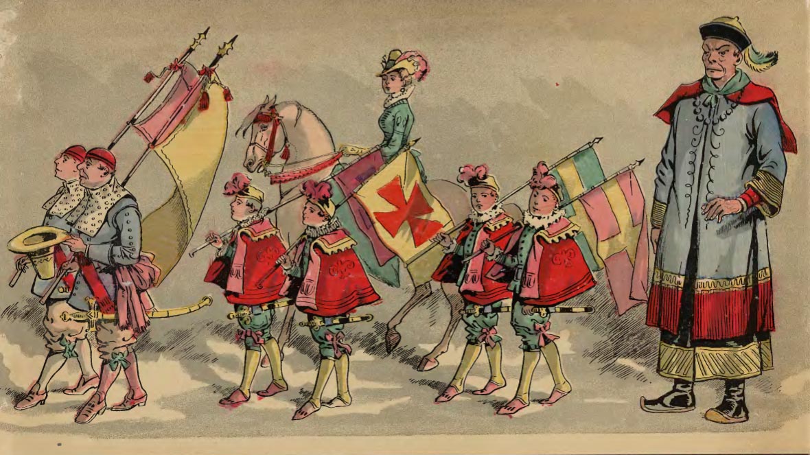 Bearing lofty poles and banners?