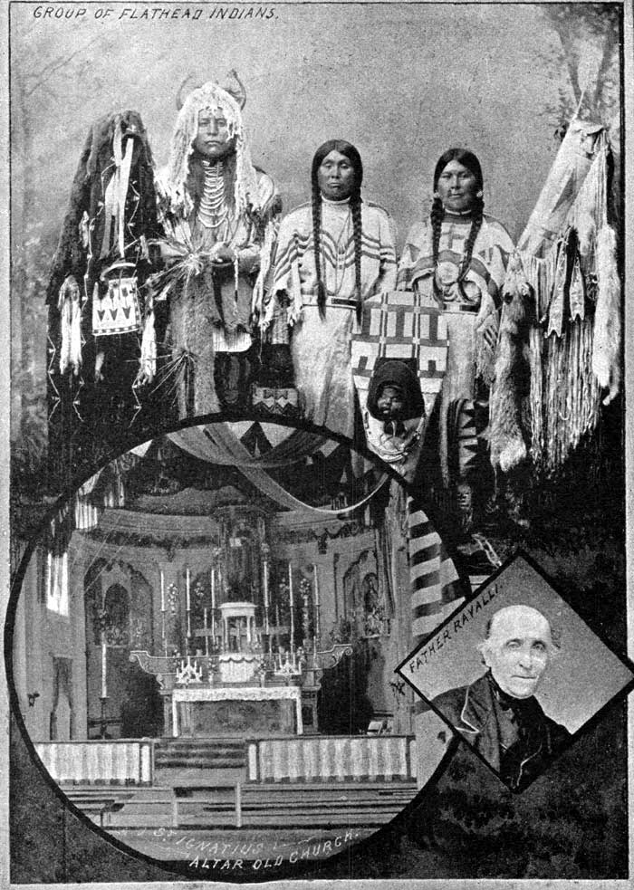 These Flathead Indians are noted for the fact that they have never adopted a hostile attitude towards white people. They are advanced in civilization, as readers of Chapter IX and its accompanying illustration will have noted. Tradition states that their religion demands that the head of every infant must be flattened by means of a board before the bones harden sufficiently to assume a shape. However this may be, none of the surviving members of the tribe have particularly flat heads, and all deny emphatically the statement that nature is ever interfered with in the manner stated. These Indians call themselves "Selish," a name apparently without reason or derivation. The Flathead Reservation was formed about forty years ago. On three sides it is walled in by high mountains, and it consists of about 2,240 square miles of territory. The railway station, Arlee, is so named after the last war chief of the Flatheads. Passengers are often amused by the gaudily decked Indians who are seen at this station, which is quite near the reservation.