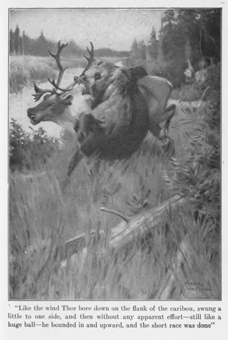 Bruce heard it as he fired his sixth unavailing shot at seven hundred yards. Langdon was reloading. For fifteen seconds Thor offered himself openly, roaring his defiance, challenging the enemy he could no longer see; and then at Langdon's seventh shot, a whiplash of fire raked his back, and in strange dread of this lightning which he could not fight, Thor continued up over the break. He heard other rifle shots, which were like a new kind of thunder. But he was not hit again. Painfully he began the descent into the next valley.