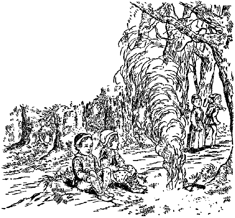 When noon came Grethel shared her bread with Hansel, who had strewn his on the path. Then they went to sleep; but the evening arrived and no one came to visit the poor children, and in the dark night they awoke, and Hansel comforted his sister by saying, "Only wait, Grethel, till the moon comes out, then we shall see the crumbs of bread which I have dropped, and they will show us the way home." The moon shone and they got up, but they could not see any crumbs, for the thousands of birds which had been flying about in the woods and fields had picked them all up. Hansel kept saying to Grethel, "We will soon find the way"; but they did not, and they walked the whole night long and the next day, but still they did not come out of the wood; and they got so hungry, for they had nothing to eat but the berries which they found upon the bushes. Soon they got so tired that they could not drag themselves along, so they lay down under a tree and went to sleep.