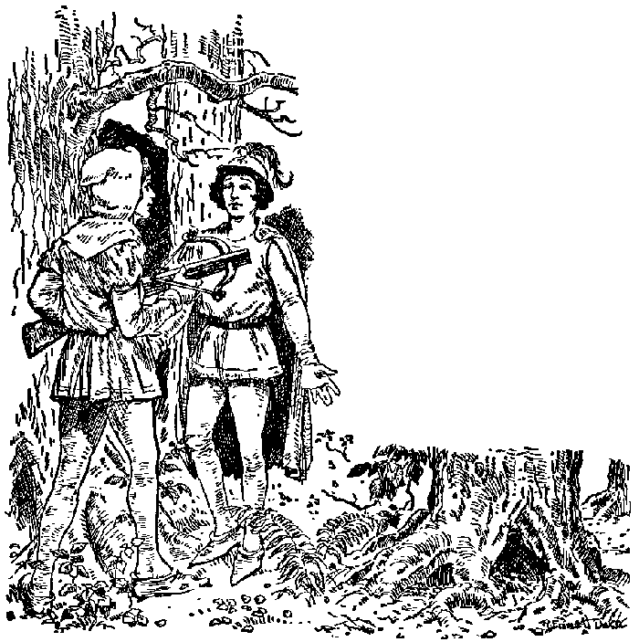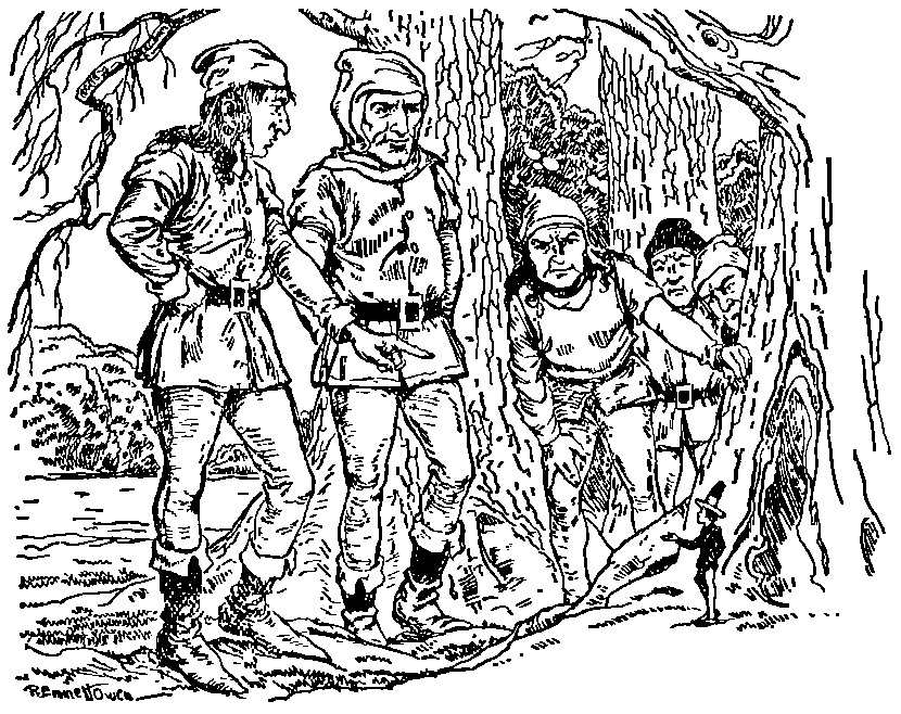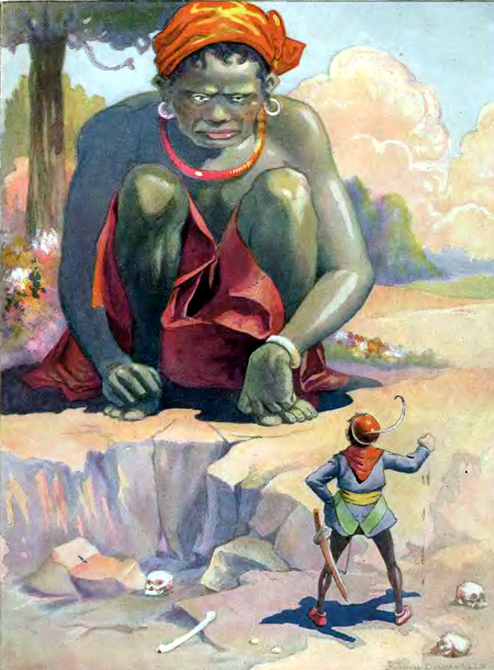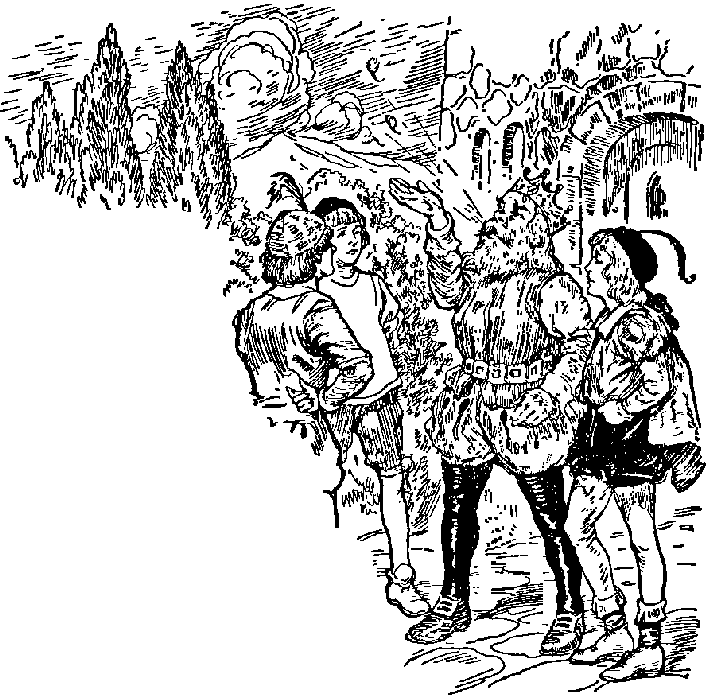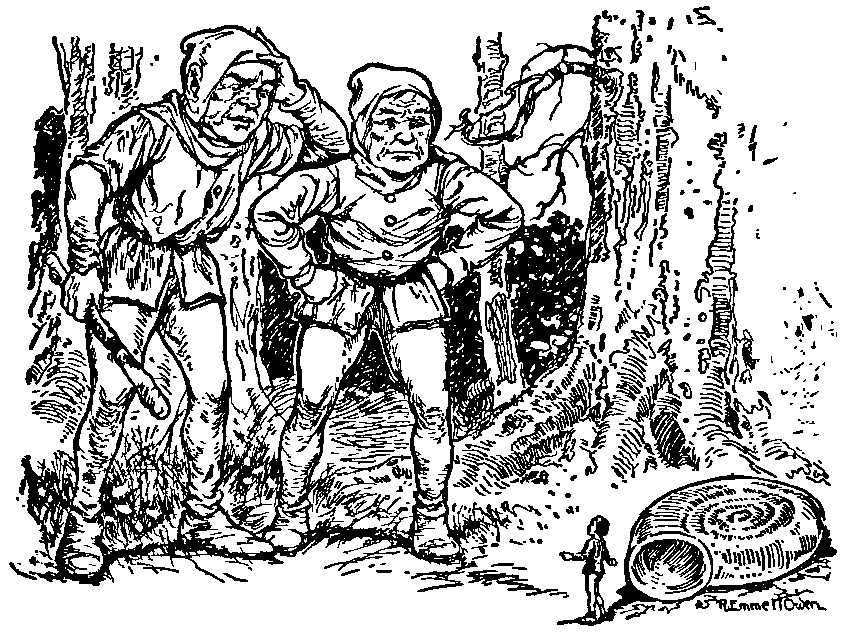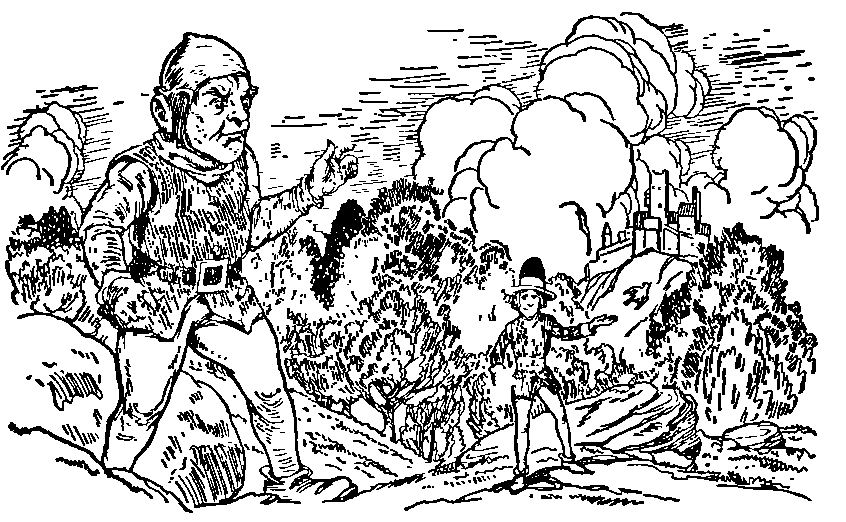 "What are you gazing at?" cried the dwarf, at the same time becoming red with rage; "and what are you standing there for, making ugly faces?" It is probable that he might have proceeded in the same complimentary manner, but suddenly a great growl was heard near by them, and a big black bear joined the party. Up jumped the dwarf in extremest terror, but could not get to his hiding-place, the bear was too close to him; so he cried out in very evident anguish—