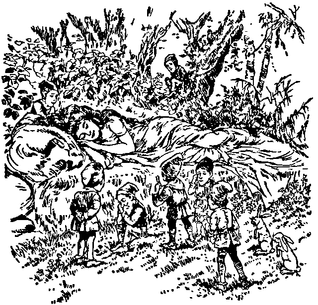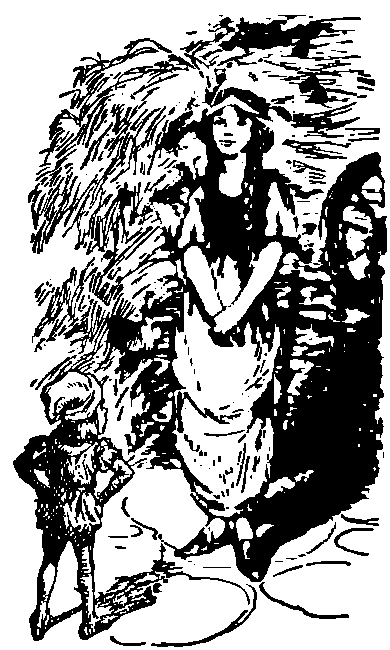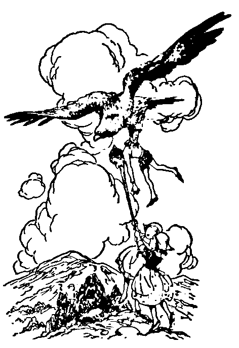 Soon after this it chanced that the poor widow sent her children to the town to purchase cotton, needles, ribbon, and tape. The way to the town ran over a common, on which in every direction large masses of rocks were scattered about. The children's attention was soon attracted to a big bird that hovered in the air. They remarked that, after circling slowly for a time, and gradually getting nearer to the ground, it all of a sudden pounced down amongst a mass of rock. Instantly a heartrending cry reached their ears, and, running quickly to the place, they saw, with horror, that the eagle had seized their former acquaintance, the dwarf, and was just about to carry him off. The kind children did not hesitate for an instant. They took a firm hold of the little man, and strove so stoutly with the eagle for possession of his contemplated prey, that, after much rough treatment on both sides, the dwarf was left in the hands of his brave little friends, and the eagle took to flight.