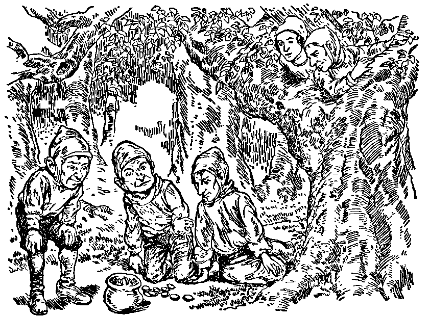 On their way back, suddenly, once more they ran across their dwarf friend. Upon a clear space he had turned out his sack of jewels, so that he could count and admire them, for he had not imagined that anybody would at so late an hour be coming across the common.