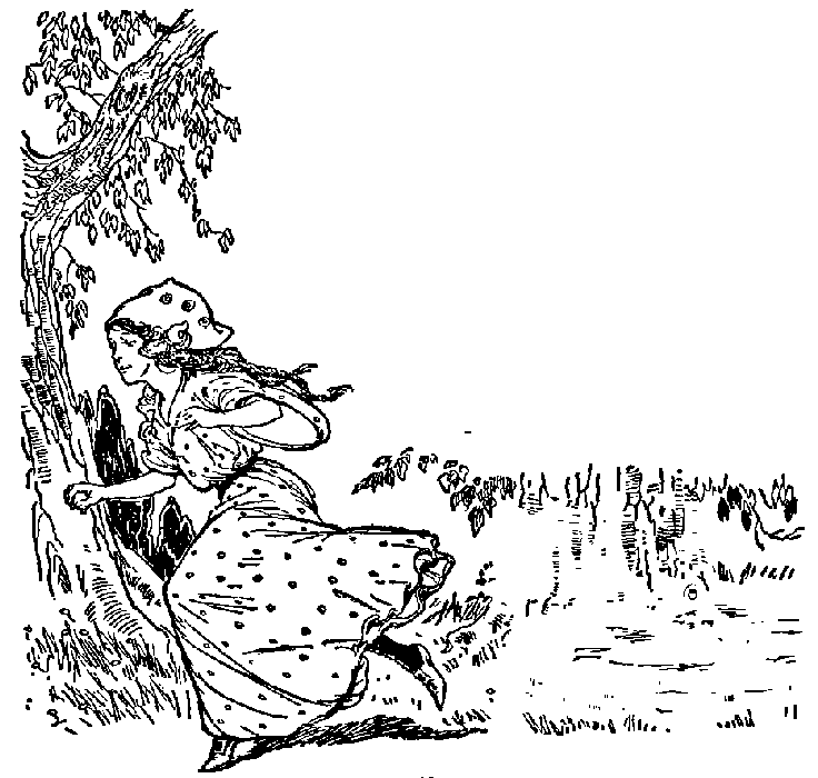One day, as they were riding along by the side of a brook, the princess began to feel very thirsty, and said to her maid, "Pray get down and fetch me some water in my golden cup out of yonder brook, for I want to drink." "Nay," said the maid, "if you are thirsty, get down yourself, and lie down by the water and drink; I shall not be your waiting-maid any longer." The princess was so thirsty that she got down, and knelt over the little brook and drank, for she was frightened, and dared not bring out her golden cup; and then she wept, and said, "Alas! what will become of me?" And the lock of hair answered her, and said—