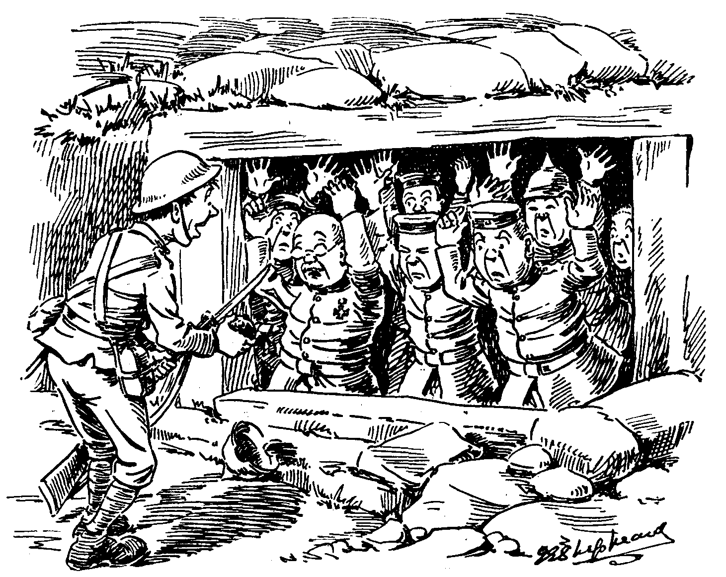 Ermyntrude reached the end of the trench and somehow got out, heading, by chance, for Germany. That was her undoing. In a minute or so three machine-guns began firing, bombs and rifle shots were heard, and Verey lights innumerable flared. We never saw Ermyntrude again. But we heard of her—or rather we read of her—for the German official report wrote her epitaph, thus: "Near the village of —— hostile raiding detachments were repulsed by our machine-gun fire."