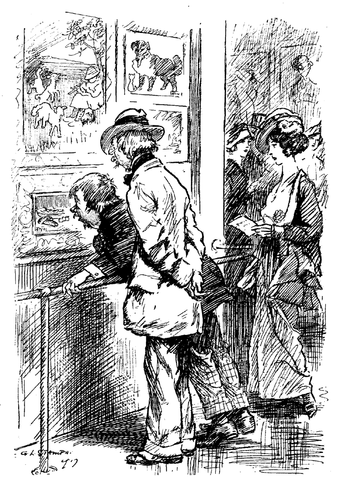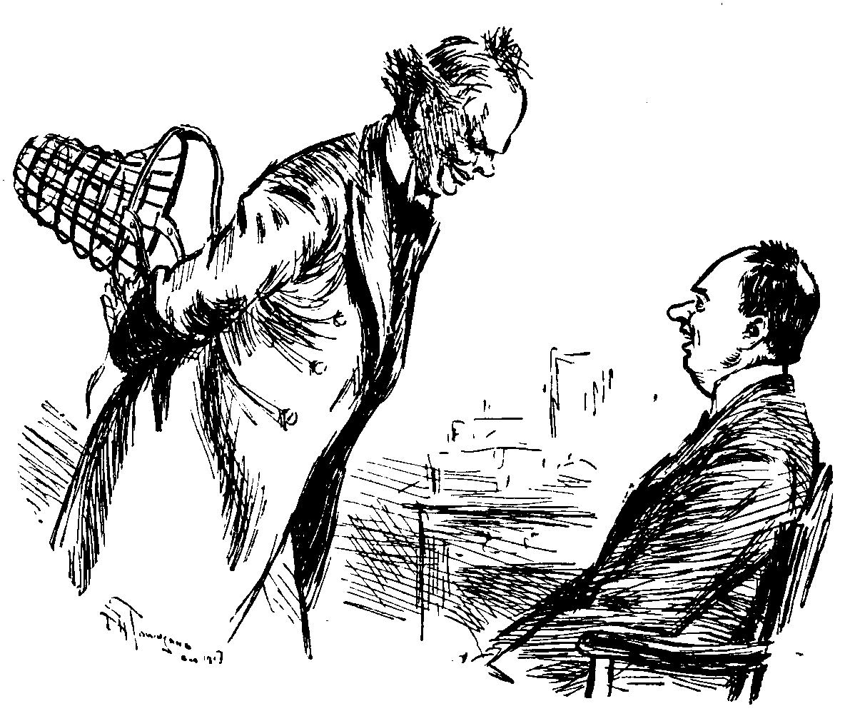 At Waterton and Paddingloo great crowds continued to board the limited number of West-bound and South-west-bound trains. On being asked why they were leaving town, those of the travellers who answered at all said it was the regular time for their annual holiday and they wanted a change. They were mostly a jolly hearty lot, happily confident that at some time in the course of the next forty-eight hours they would be deposited in some part of the West or South-west of England. Those fortunate persons who had secured seats were sitting down, those who were unable to get seats were standing, and, in spite of the congested state of the carriages and corridors, almost all were smiling, the exceptions being those highly-strung and excitable passengers who had come to blows over corner seats and windows up or down. Many of the travellers carried baskets of food. Your representative, anxious to report on the quality and quantity of the provisions carried, ventured to peep into one of the baskets, and was in consequence involved in a rather unpleasant affair, being actually accused of having abstracted a sandwich!