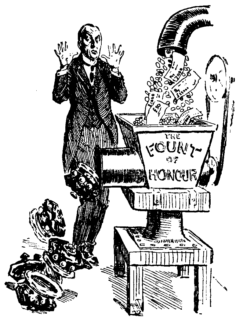 "Just as a soldier gives his valour or a captain of industry his talent," said Lord CURZON, speaking on the sale of titles, "so a wealthy man gives his wealth, which is very often his only asset, for the benefit of his country." Nothing like a delicate compliment or two to encourage him in the good work.