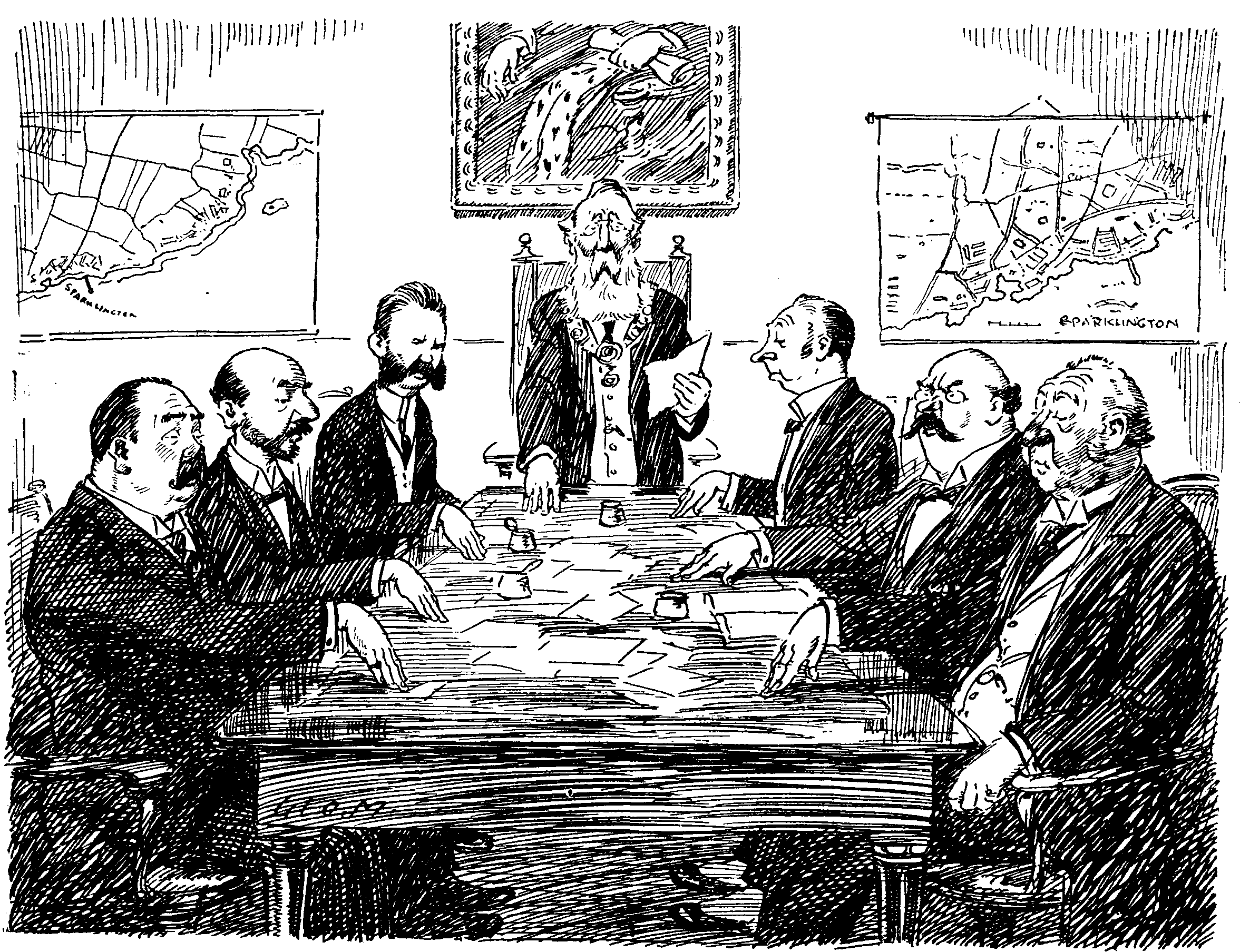 THE MAYOR AND CORPORATION OF SPARKLINGTON-ON-SEA SOLEMNLY TOUCHING WOOD ON THE OCCASION OF THEIR SENDING OUT TO THE PRESS A NOTICE THAT THEIR TOWN HAS NEVER SUFFERED FROM ENEMY AIR-RAIDS.