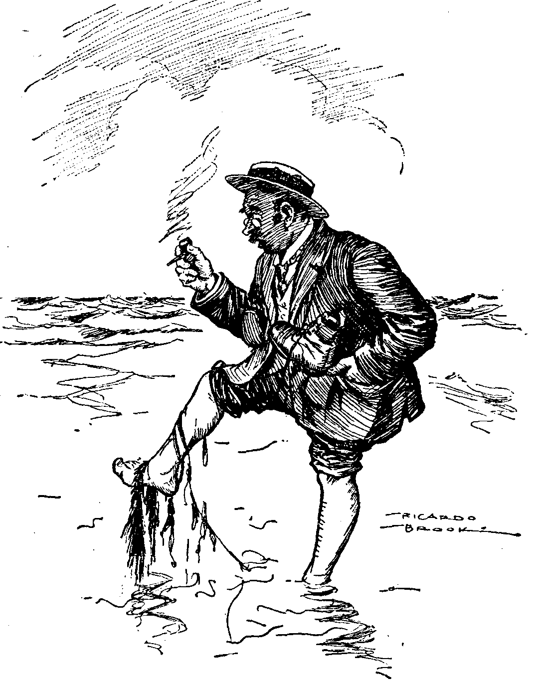 I met the mercurial Gosling at the club a few days ago. As I hadn't seen him for some time I asked if he had been on a holiday. "Yes," he said, "down at Shinglestrand. Golfing? No—yes. I did play one game, the first since the War, and rather a remarkable game it was. I'm a member of the golf-club there, and was down at the clubhouse one morning looking at the papers when a fat middle-aged man, about my age, asked me if I cared for a game. I didn't, but in a spirit of self-sacrifice said that I should be very glad. 'I think I ought to tell you,' he went on, 'that I don't care about playing with a 18-handicap man, and that I always like to have a sovereign on the match.' Now I never was much of a player—too erratic, I suppose. My handicap has gone up from 12 to 18, and the last time I played it was about 24. But, exasperated by his swank, I suddenly found myself saying, 'My handicap is 12.' 'Very well,' replied the fat man, 'I'll give you 4 strokes.' We went out to the first tee, and after he had made a moderate shot I hit the drive of my life. My second landed on the green and I ran down a long putt—this for a 4-bogey hole. I'm not going to bore you with details. I won the second and third holes, and then the fat man went to pieces. I never wanted any of my strokes and downed him by 5 and 3. As we re-entered the club-house my partner, who had become strangely silent, walked up to the board which gives the list of handicaps and looked at them. There was my name with 18 opposite it. 'I thought you said your handicap was 12,' he observed. 'Well,' I answered, 'it wasn't more than that this morning.' The fat man was very angry. He said he would report me to the committee, and he did. But the secretary (who happens to be my brother) played up nobly. He communicated with the secretary of the fat man's club, whom he happened to know, and, having found out that the fat man's handicap was not 6 but 12, he wrote to him to say that in view of the fact that 'the lies had been equally bad on both sides' the committee did not propose to take any action. The fat man got no change out of my brother and I kept my sovereign."