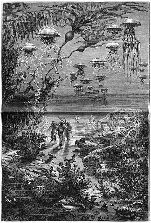 Overal kwam het monster in de mode: in koffiehuizen werd het bezongen, in de dagbladen bespot, zelfs op het tooneel opgevoerd; het gaf schoone gelegenheid om er tal van leugens op te verzinnen; als de dagbladen gebrek aan stof hadden, werden wederom allerlei denkbeeldige en reusachtige wezens besproken van den witten walvisch, dien vreeslijken “Maby Dick” uit de poolstreken tot den onmetelijken Kraken toe, wiens voelarmen een schip van 500 ton konden omvatten en het in de diepten van den Oceaan medeslepen. Men haalde zelfs verhalen op uit de oudheid, de meeningen van Aristoteles en Plinius, die aan het bestaan van zulke monsters geloof hechtten, vervolgens de verhalen van den Noorweegschen bisschop Pontoppidan, het relaas van Paul Heggede, en eindelijk het verslag van Harrington, wiens goede trouw men niet kan verdenken als hij de verzekering geeft dat hij in 1857 aan boord van den Castillaan de groote zeeslang gezien heeft, welke tot nog toe slechts in de verbeelding van vroegere dagbladschrijvers bestaan had.