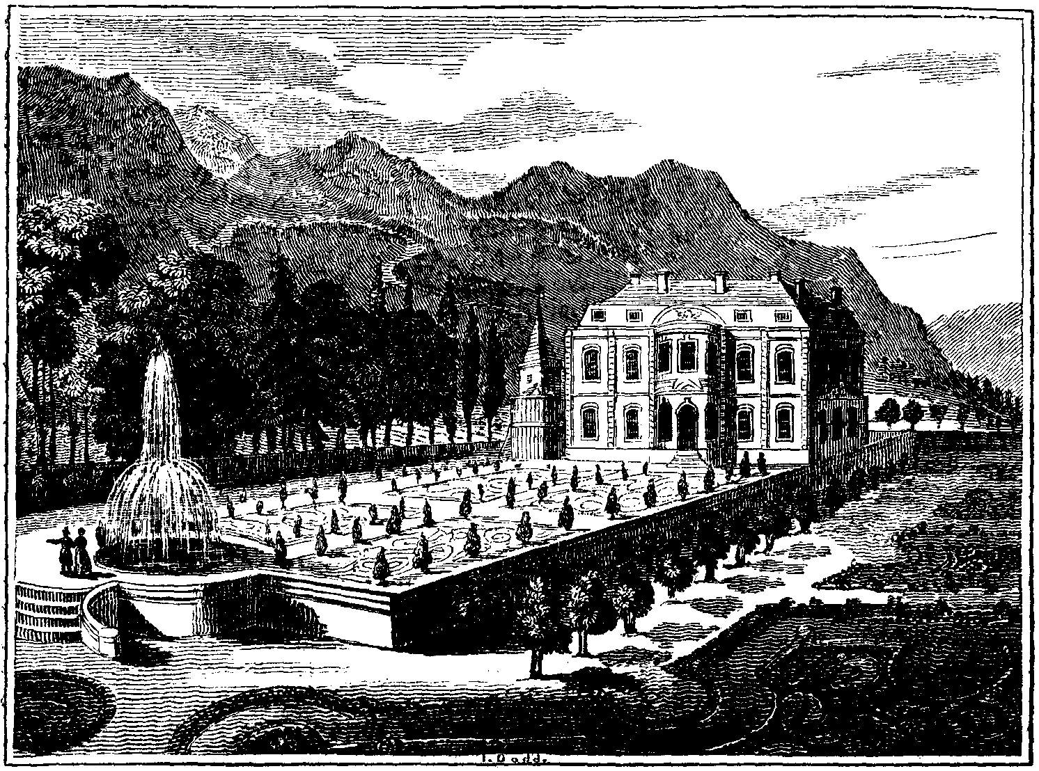 But we turn from Voltaire and his stormy times to the seat of his retirement—Ferney, about six miles from Geneva; where he lived for twenty years; but in his eighty-fourth year actually quitted this scene of delightful repose for the city of Paris—there to enjoy a short triumph, and die. The latter event took place in 1778. At pages 62 and 69 of vol. xii. of THE MIRROR, we have given a brief description of Ferney, with many interesting anecdotes, carefully compiled from a variety of authorities. Here Voltaire lived in princely style, as Condorcet says, "removed from illusion, and whatever could excite momentary, or personal passion." According to M. Simond, a recent tourist, the château is still visited by travellers, and Voltaire's bed-room is shown in the state he left it. The date of our view is about the year 1800, since which the residence has been much neglected: and during the late war, it was frequently the quarters of the Austrian soldiers. The gardens are laid out in the formal, geometrical style, and they command a view of the town and lake of Geneva. The apartments of the ground-floor of the house are in the same state as during Voltaire's lifetime. In the dining-hall is a picture, representing demons horsewhipping Fréron:1 such was Voltaire's mode of perpetuating his antagonists.