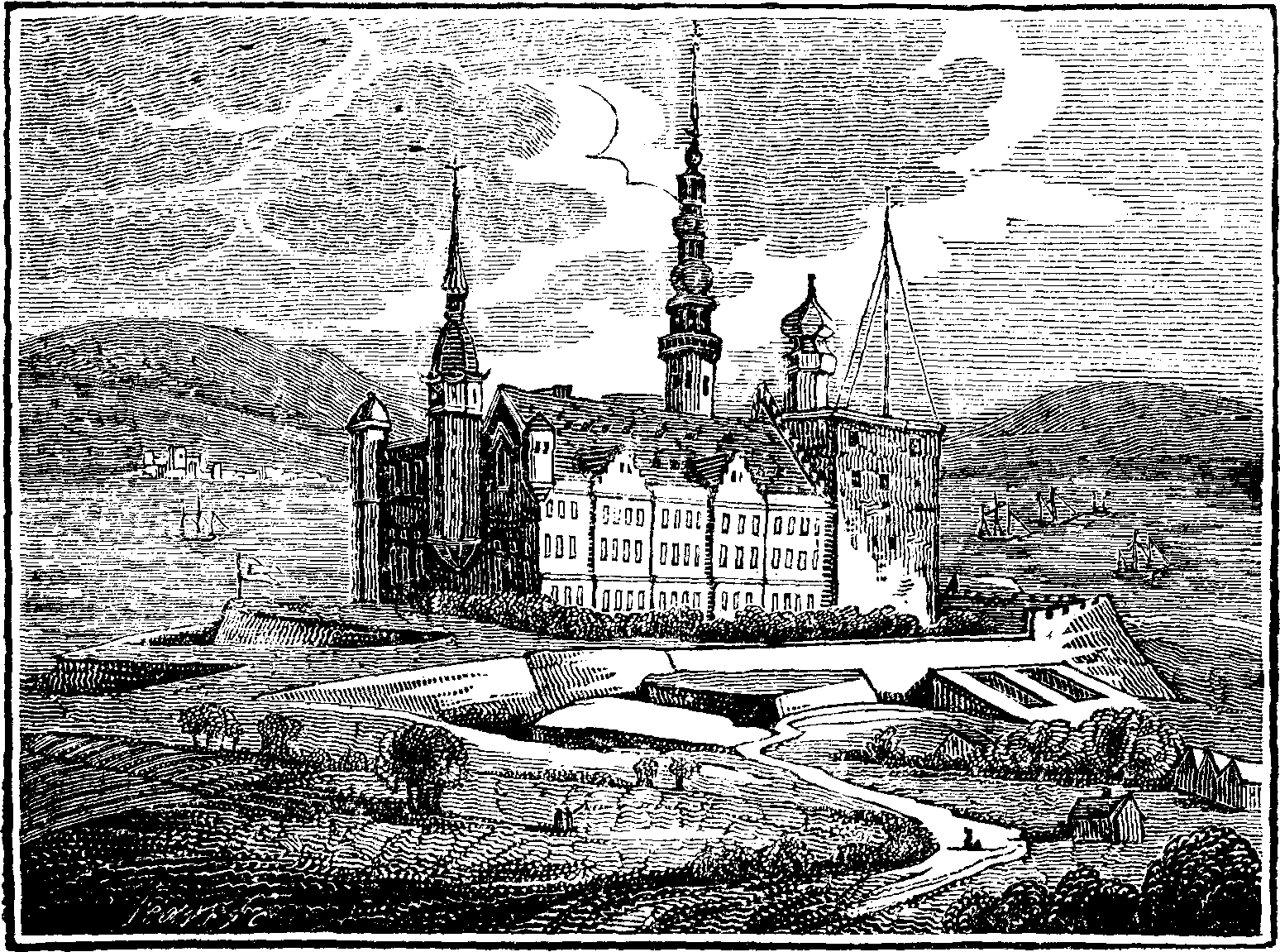 The present edifice is erected on the brow of a gently rising hill, the summit of which is gained by means of a winding walk cut through a small shrubbery. In the surrounding prospect, the town of Elsineur, on the plain beneath, presents itself ill-built, red, and without any public building, or spire, to vary its sameness. Far to the left of the city stands the castle of Kronenberg, a bold and fine [pg 282] feature; the waves of the Cattegut roll at its feet; and are bounded on the opposite side by the Swedish coast. When the annexed sketch was made, 400 sail of merchants' ships were lying there at anchor, which added greatly to the interest of the picture. The small village on the distant shore is Elsenberg. The forest of Kronenberg is indeed proudly situated; the form of the building, with its spires and minarets, is nobly picturesque; the fabric is of grey stone; and its innumerable windows, varied towers, and other architectural ornaments, make it a striking and beautiful contrast to the dull uniformity of the town.