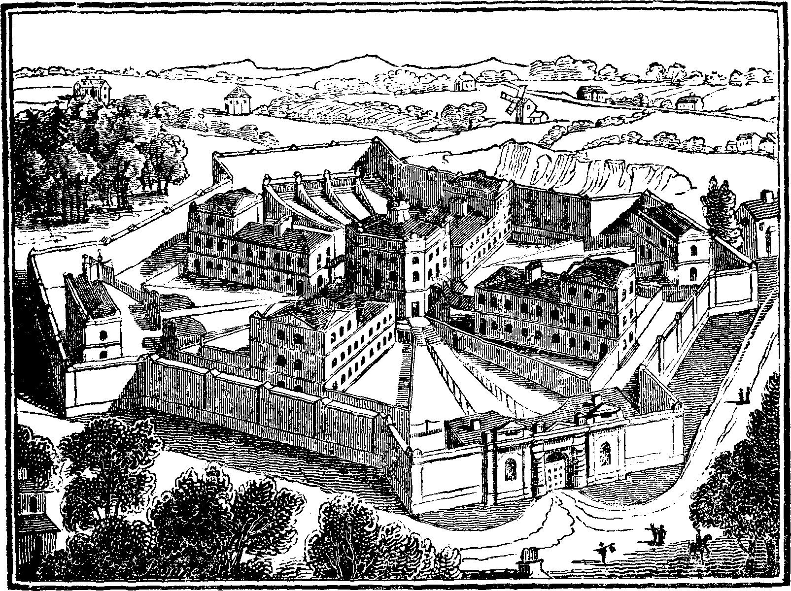 The old gaol in the city of Norwich, in the year 1823, being found no longer secure, nor according to the new act of parliament, admitting of sufficient room for the classification of the prisoners, the magistrates came to a resolution of erecting a new one outside the city, near St. Giles's gates; the same was accordingly advertised in the Norwich papers, in which architects were requested to send plans, elevations, and sections, (in competition,) accompanied with an estimate of the total expense of the new building. A great number of designs were in consequence submitted, when the plan sent by Mr. Brown, of Wells-street, Oxford-street, London, was adjudged to be the best: his plan was therefore adopted and carried into execution, of which the annexed engraving is a faithful representation, taken from the tower of St. Giles's Church, in the city of Norwich. The foundation stone was laid in 1824, and the building finished this year, 1827. It is designed to hold 120 prisoners, besides the necessary turnkeys and servants, and has cost the city £23,000; the boundary wall is quadrangular, but is cut off at the junction of the four angles by bastions, thereby giving to the wall a greater stability; the whole circumference is 1,220 feet, and encloses an area of one acre, two roods, and thirty-four poles, being nearly one acre and three quarters of ground.
