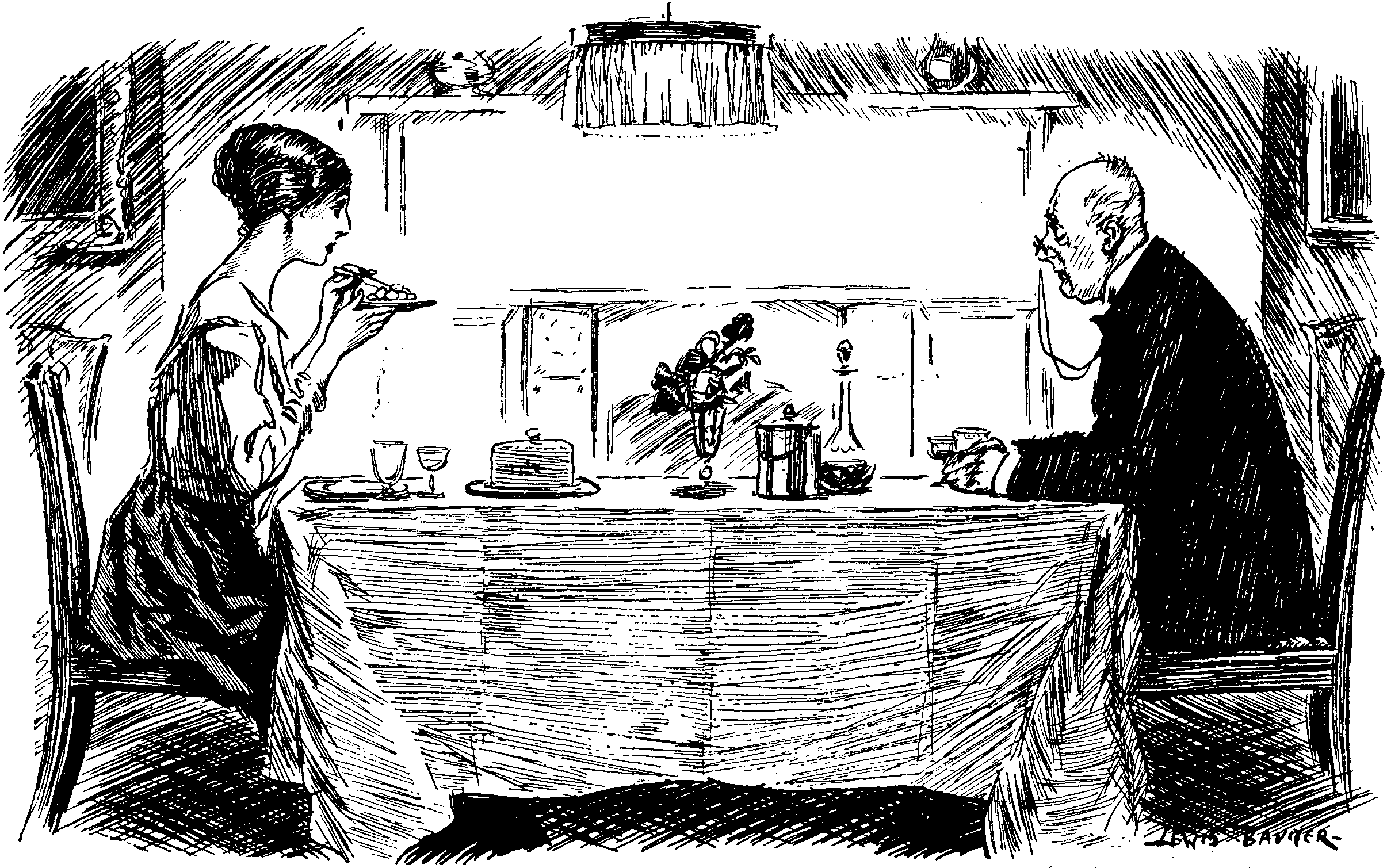 Having read the first instalment, with the author's eye fixed embarrassingly upon me, and the author giggling as she watched, I said that it was very interesting; as indeed it was. I went on to ask what part of America they were all going to, and how it would end, and so on; and Enid sketched the probable course of events, which included a duel for Lord Eustace and Mr. Ploot (who turned out to be not a millionaire at all, but a gentleman thief) and a very exciting time for the Lady Lily on a ranche in Texas, whither she had followed Jack Crawley, who was to become famous throughout the States as "The Cowboy King." I forget about the Duke and Duchess, but a lover was to be found on the ranche for Fanny Starlight; and Red Indians were to carry off Webb, who was to be rescued by the Cowboy King; and so on. There were, in short, signs that Enid had not only read the feuilletons in the picture papers but had been to the Movies too. But no matter what had influenced her, the story promised well.