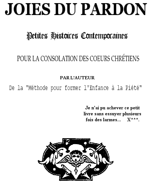 Note 1: (retour) ***Cité dans les Petites lectures, bulletin populaire des Conférences de Saint-Vincent-de-Paul.—Nous n'avons pu vérifier nous-même, on le comprend, l'authenticité des traits que nous avons puisés dans d'autres Recueils; mais pourquoi la mettre en doute: Il est certain qu'il s'opère fréquemment des conversions tout aussi extraordinaires que celle-là; le prêtre n'y prend même plus garde dans les pays de foi, tant il est souvent témoin de ces merveilles, et elles restent un secret entre l'homme et Dieu.
