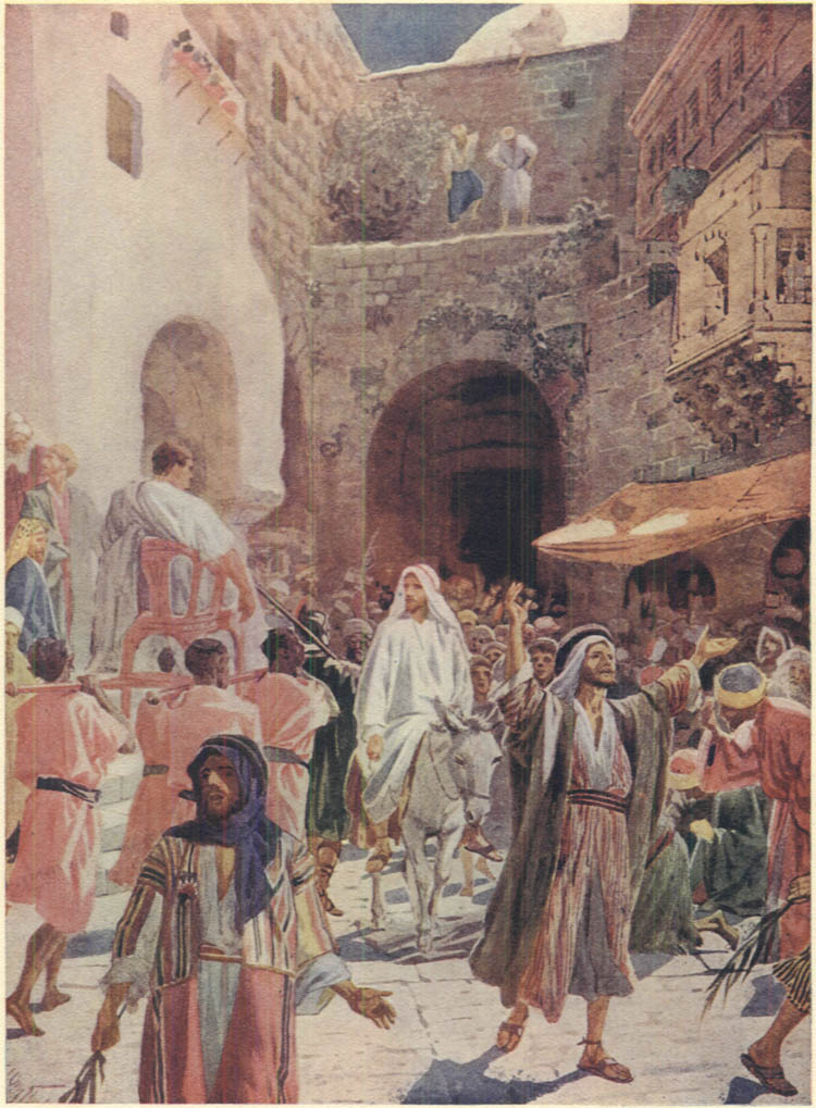 And when they drew nigh unto Jerusalem, and were come to Bethphage, unto the mount of Olives, then sent Jesus two disciples. Saying unto them, Go into the village over against you, and straightway ye shall find an ass tied, and a colt with her: loose them, and bring them unto me. And if any man say ought unto you, ye shall say, The Lord hath need of them; and straightway he will send them. All this was done, that it might be fulfilled which was spoken by the prophet. And the disciples went, and did as Jesus commanded them. And brought the ass, and the colt, and put on them their clothes, and they set him thereon. And a very great multitude spread their garments in the way; others cut down branches from the trees, and strawed them in the way. And the multitudes that went before, and that followed, cried, saying, Hosanna to the son of David: Blessed is he that cometh in the name of the Lord; Hosanna in the highest. And when he was come into Jerusalem, all the city was moved, saying, Who is this? And the multitude said, This is Jesus the prophet of Nazareth of Galilee.—St. Matt, xxi: 1-4., 6-11.