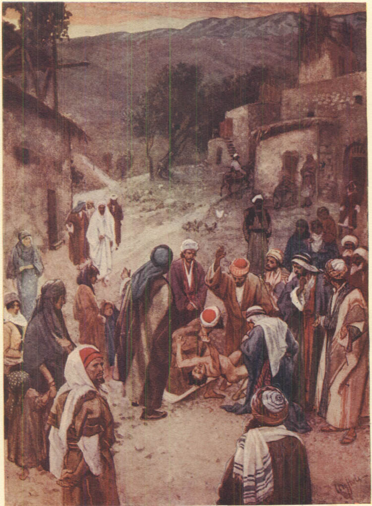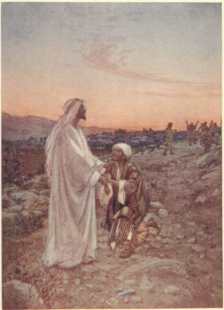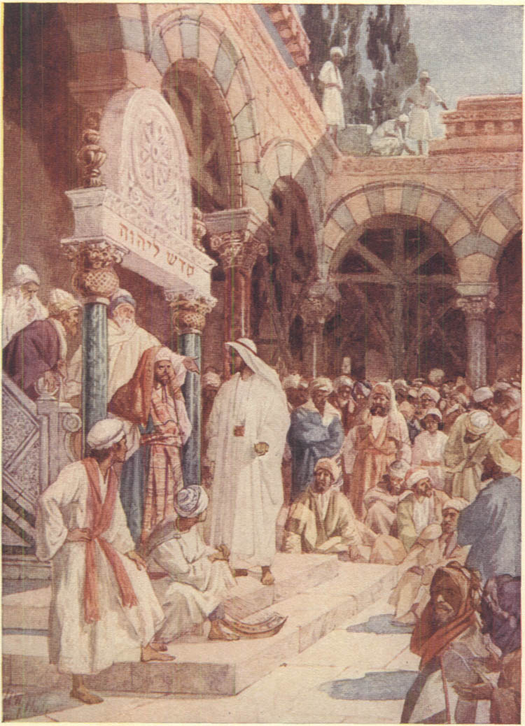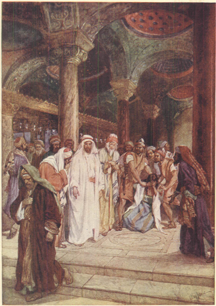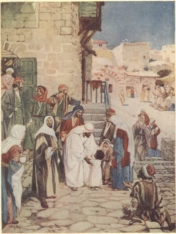 In the Hebrew Bible—the Talmud—it is stated that, according to pious custom, parents brought their little children to the synagogue that they might receive the benefit of the prayers and blessings of the elders. Rabbis also, of recognized sanctity, were frequently appealed to in a like manner; and his fame as a prophet and benefactor having preceded him into Peraea, infants were now brought to Jesus, that he might lay his hands upon them in supplication and blessing. The architectural setting of the picture is adapted from that of a small square near the Damascus Gate of Jerusalem. This kindly and gentle act of our Lord has been of incalculable consequence to the life of children in the development of Christian civilization.