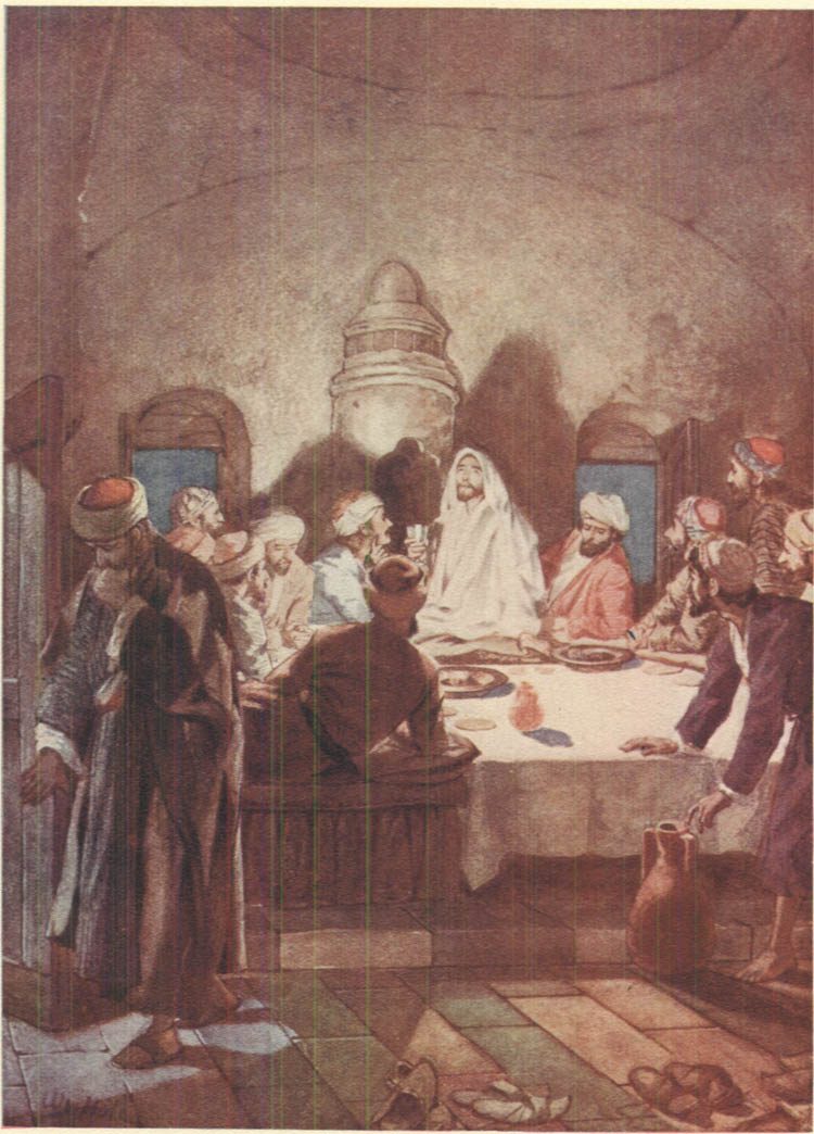 Many of the pictures that we see of this last Supper, represent the company as seated round a table, very much in the way in which we are accustomed to sit ourselves. But this is not correct. The people in those Eastern countries were not accustomed to sit as we do. On this occasion the roasted lamb, with the bread and wine to be used at the feast, was placed on a table, and the guests reclined on couches round the table, each man leaning on his left arm, and helping himself to what he needed with his right hand.