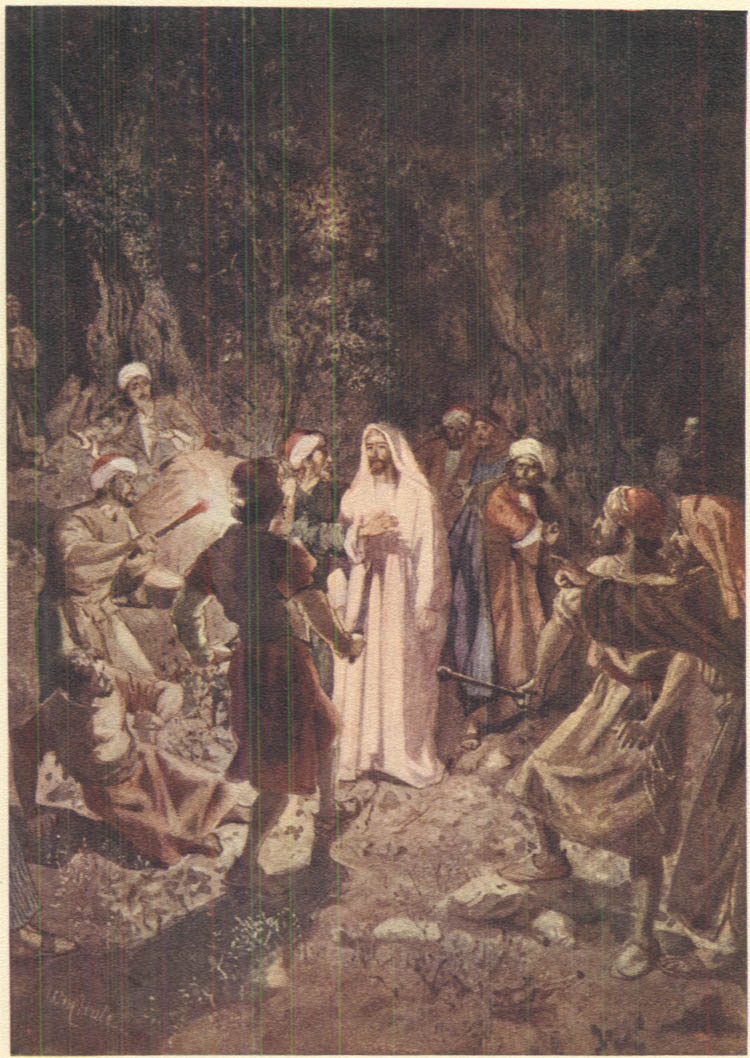 Judas then, having received a band of men and officers from the chief priests and Pharisees, cometh thither with lanterns and torches and weapons. Jesus therefore, knowing all things that should come upon him, went forth, and said unto them, Whom seek ye? They answered him, Jesus of Nazareth. Jesus saith unto them, I am he. And Judas also, which betrayed him, stood with them. As soon then as he had said unto them, I am he, they went backward, and fell to the ground.—Now he that betrayed him gave them a sign, saying, Whomsoever I shall kiss, that same is he: hold him fast. And forthwith he came to Jesus, and said, Hail, master; and kissed him. And Jesus said unto him, Friend, wherefore art thou come? Then came they, and laid hands on Jesus, and took him. And, behold, one of them which were with Jesus stretched out his hand, and drew his sword, and struck a servant of the high priest's, and smote off his ear. Then said Jesus unto him, Put up again thy sword into his place: for all they that take the sword shall perish with the sword. Thinkest thou that I cannot now pray to my Father, and he shall presently give me more than twelve legions of angels? But how then shall the scriptures be fulfilled, that thus it must be? In that same hour said Jesus to the multitudes, Are ye come out as against a thief with swords and staves for to take me? I sat daily with you teaching in the temple, and ye laid no hold on me. But all this was done, that the scriptures of the prophets might be fulfilled. Then all the disciples forsook him, and fled.—St. John xviii: 3-6; St. Matt, xxvi: 48-56.