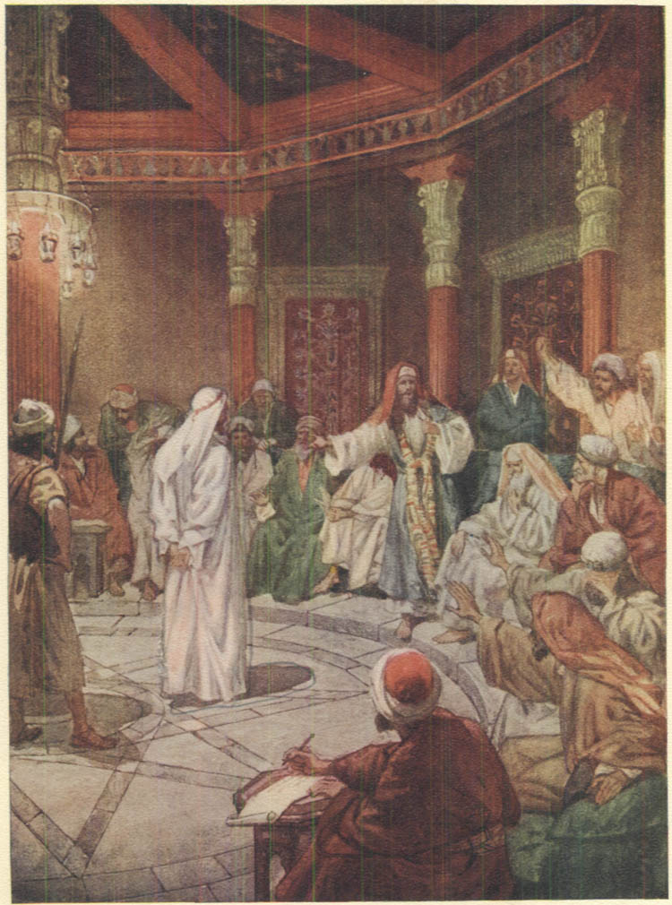 The outward ceremonial of the hastily convoked and Irregular tribunal before which Jesus underwent the mockery of a trial was similar to that of the ancient Sanhedrim. The members sat on a semi-circular divan, the president in the centre, and a scribe at each extremity, who recorded the evidence and the decisions of the court. It may be noted, that while laws had been carefully formulated for the conduct of such trials, almost every one of them was flagrantly violated on the present occasion in order to ensure a pre-arranged condemnation. For example, these rules provided that witnesses should be summoned, and that an advocate should plead on behalf of the accused; and they forbade that criminal trials should be conducted at night, that condemnation should be pronounced on the day of trial or on a holy day; and, if the crime were capital, that execution should follow on the day of sentence.