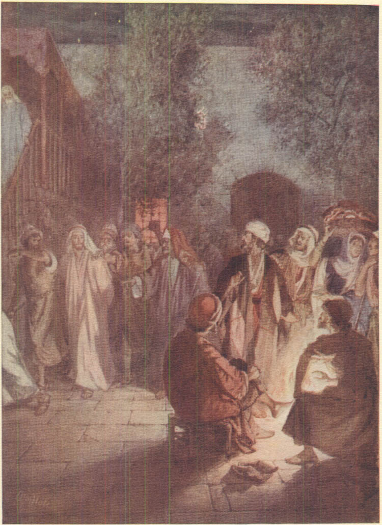 In the East, the houses of the great and official residences usually consist of a group of separate yet connected buildings, surrounding a quadrangular paved court planted with trees and flowering shrubs, and furnished in the centre with an open cistern or fountain. Such was probably the construction of the palace of the High Priest (Caiaphas), and, apparently, this open court, across which Jesus would be conducted to or from the hall of trial, was the place where bitterness was added to his sorrow in hearing himself denied by his friend—and that man who had been the first to profess belief in his Messiahship, and who, but a few brief hours before, had stoutly sworn to stand by him, even unto death.