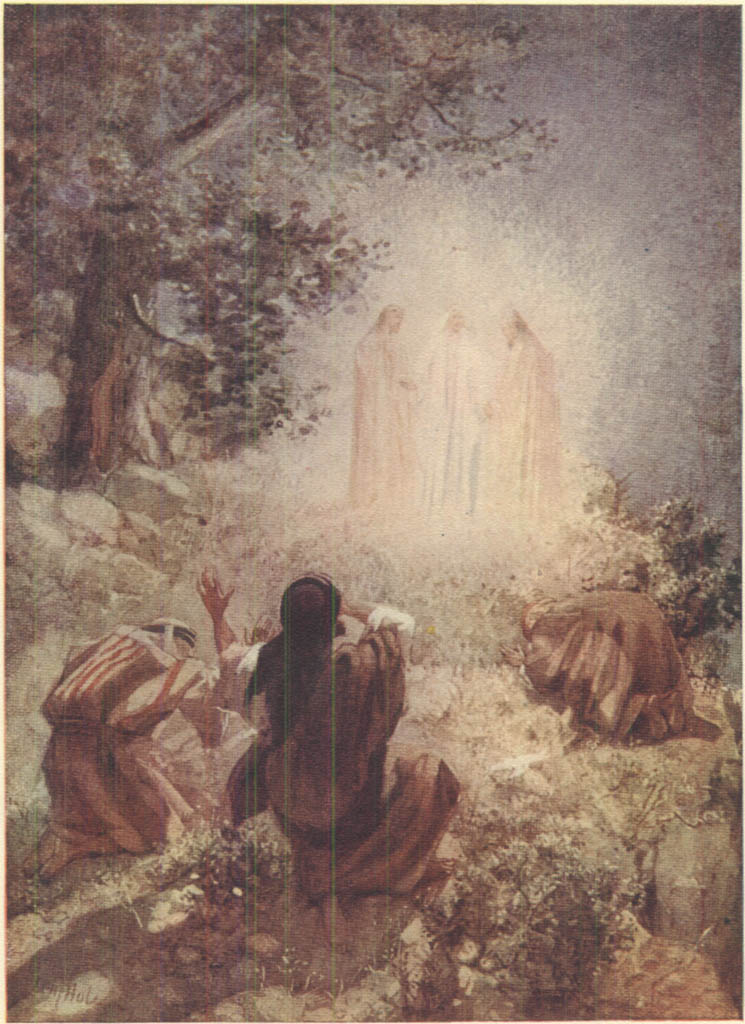 And after six days Jesus taketh Peter, James, and John his brother, and bringeth them up into an high mountain apart. And was transfigured before them: and his face did shine as the sun, and his raiment was white as the light. And, behold, there appeared unto them Moses and Elias talking with him. Then answered Peter, and said unto Jesus, Lord, it is good for us to be here: if thou wilt, let us make here three tabernacles; one for thee, and one for Moses, and one for Elias. While he yet spake, behold, a bright cloud overshadowed them: and behold a voice out of the cloud which said, This is my beloved Son, in whom I am well pleased; hear ye him. And when the disciples heard it, they fell on their face, and were sore afraid. And Jesus came and touched them, and said, Arise, and be not afraid. And when they had lifted up their eyes, they saw no man, save Jesus only.—St. Matt, xvii: 1—8.