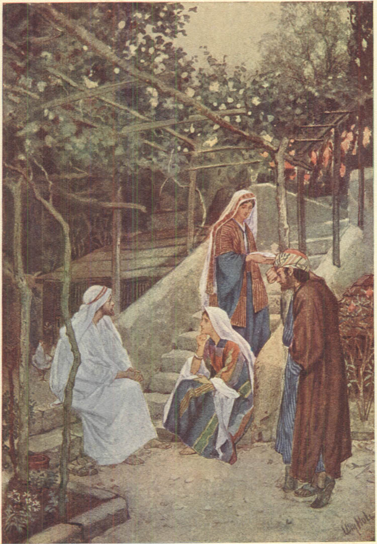 Bethany is situated on the southern slope of the Mount of Olives, about two miles from Jerusalem. The house of his friends, Martha, Mary, and Lazarus, the only place which, during the latter part of his ministry, Jesus could call a home, was probably that of people in easy circumstances, and as such is here represented. In the vineyards of Palestine the vine is cultivated bushlike on the ground; but in gardens, the plant is occasionally trained erect, as in Europe and America, or, as in the present instance, for the purposes of shade, upon a pergola. In the middle of the village of Bethany are the ruins of an important house. Here some years ago a French explorer discovered on the base the remains of an ancient chapel This seems to point with probability to a valid tradition of the site of the house of Martha, Mary, and Lazarus.