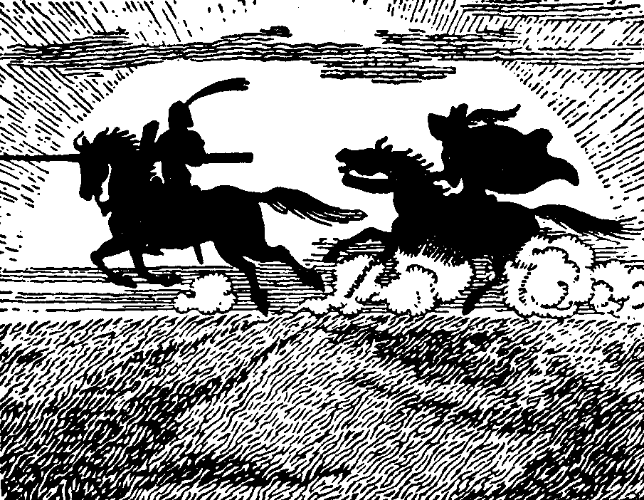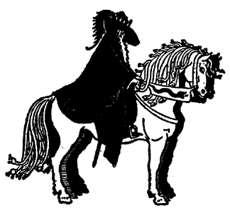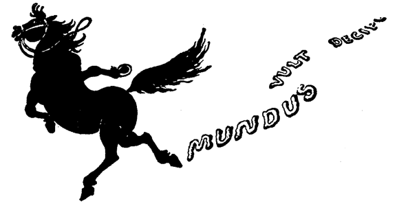 Then the Count armed and departed from Storisende, riding on the black horse, in jeweled armor, and carrying before him his black shield upon which was emblazoned the silver stallion of Poictesme and the motto Mundus vult decipi. Behind him was Grandfather Death on the white horse, carrying the Count's grave-clothes in a neat bundle. They rode toward the sunset, and against the yellow sunset each figure showed jet black.