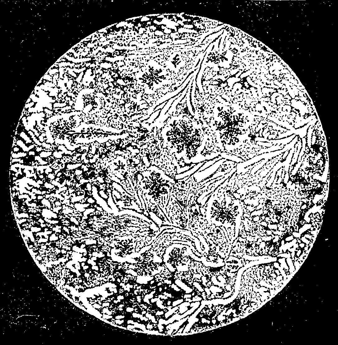 In this particular case, the faint punctation of the surface may possibly indicate the presence of air vesicles of a size sufficiently great to be visible under the microscope. But in many other instances I have failed to detect any such indication, even with much higher powers. The small ramifying tubules might at first sight be taken for some traces of a vegetable tissue, but my colleague, Dr. Scott, assures me that they do not in the least resemble any tissue found in the bamboo. I have myself no doubt that it is an inorganic structure. It is not improbably analogous to the peculiar ramifying tubules formed in a solution of water glass when a crystal of copper sulphate is suspended in it, as shown by Dr. Heaton (Proc. Brit. Assoc., 1869, p. 127). Similar forms also occur on a larger scale in some agates, and the artificial cells of Traube may probably be regarded as analogous phenomena.