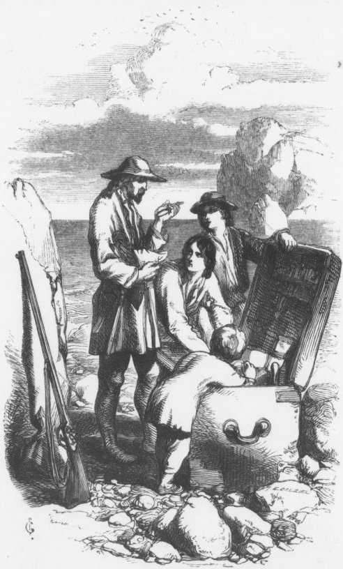 At break of day we were awake and ready, and after morning prayer, I addressed my children thus: “We are now, my dear boys, with the help of God, about to attempt our deliverance. Before we go, provide our poor animals with food for some days: we cannot take them with us, but if our voyage succeed, we may return for them. Are you ready? Collect what you wish to carry away, but only things absolutely necessary for our actual wants.” I planned that our first cargo should consist of a barrel of powder, three fowling-pieces, three muskets, two pair of pocket pistols, and one pair larger, ball, shot, and lead as much as we could carry, with a bullet-mould; and I wished each of my sons, as well as their mother, should have a complete game-bag, of which there were several in the officers’ cabins. We then set apart a box of portable soup, another of biscuit, an iron pot, a fishing-rod, a chest of nails, and one of carpenter’s tools, also some sailcloth to make a tent. In fact my boys collected so many things, we were compelled to leave some behind, though I exchanged all the useless ballast for necessaries.