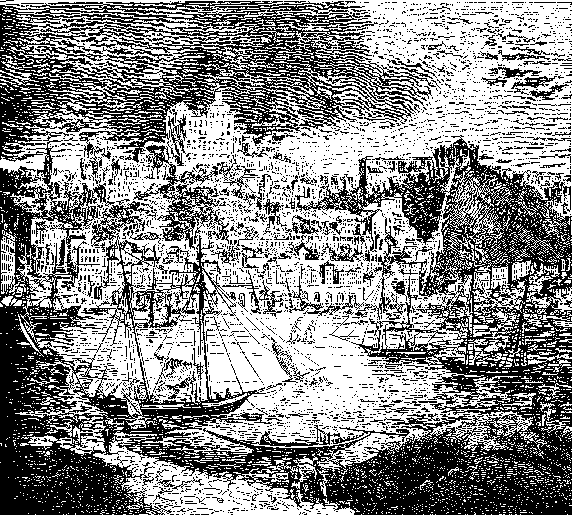 To economize time and space we must quit this enchanting spot. Gondolas, like those at Venice, are used on the river, but will not suffice for our celerity. We must reach at once the point of our Engraving. The view is taken from Villa Nova, an important suburb of Oporto, on the opposite bank of the river. The city may be divided into the high and the low town. It contains, in a civil sense, five wards, or bairros, of which the Sé, or cathedral hill, and the Vittoria, or height opposite to the Sé, (and crowned by a church, which was founded in commemoration of a celebrated battle fought on the spot with the Moors, which terminated in their defeat and expulsion from the place,) form the town properly called Oporto; and it is possible still to trace the remains of the old wall, which formerly surrounded and defended the place. The three other quarters, San Idelfonso, Miragaya, and Villa Nova, are open. The latter is connected with the principal town by a bridge of boats, which is so badly constructed as to be scarcely able to sustain the violent power of the river when swelled by winter torrents. The Douro, like the Rhine and the Rhone, and all other rivers which flow through a rocky and often confined channel, commits at certain seasons the greatest ravages; and property to a considerable amount is annually lost at Oporto, by the irresistible force with which the river pours down and carries every thing before it. A bridge of granite has been long talked of to connect Villa Nova and Oporto, but the funds are not yet forthcoming, and the expense will be considerable.
