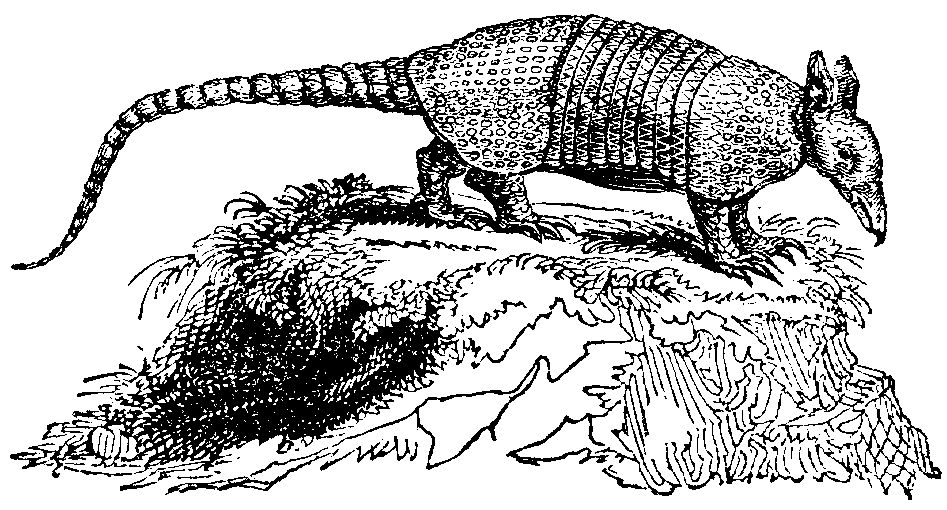 Some of the species have nocturnal habits and are very timid, flying to their burrows the moment they hear a noise. Other species quit their retreat equally by day and night, and these are said not to be so rapid in their motions as the others. All the species walk quickly, but they can neither leap, run, nor climb; so that, when pursued, they can only [pg 57] escape by hiding themselves in their holes; if these be too far off, the poor hunted creatures dig a hole before they are overtaken, and with their strong snout and fore claws in a few moments conceal themselves. Sometimes, however, before they are quite concealed, they are caught by the tail, when they struggle so powerfully that the tail often breaks short, and is left in the hands of the pursuers. To prevent this the hunter tickles the animal with a stick, till it looses its hold, and allows itself to be taken without further resistance. At other times, when pursued, and finding flight ineffectual, the Armadillos withdraw the head under the edge of the buckler of the shoulders; their legs, except the feet, are naturally hidden by the borders of the bucklers and the bands; they then contract the body as far towards the shape of a ball as the stretching of the membrane which unites the different movable pieces of the armour will permit.8 Thus defended, they frequently escape danger; but if near a precipice, the animal will sometimes roll itself over, and in this case, says Molina, in his Natural History of Chili, it generally falls to the bottom unhurt.