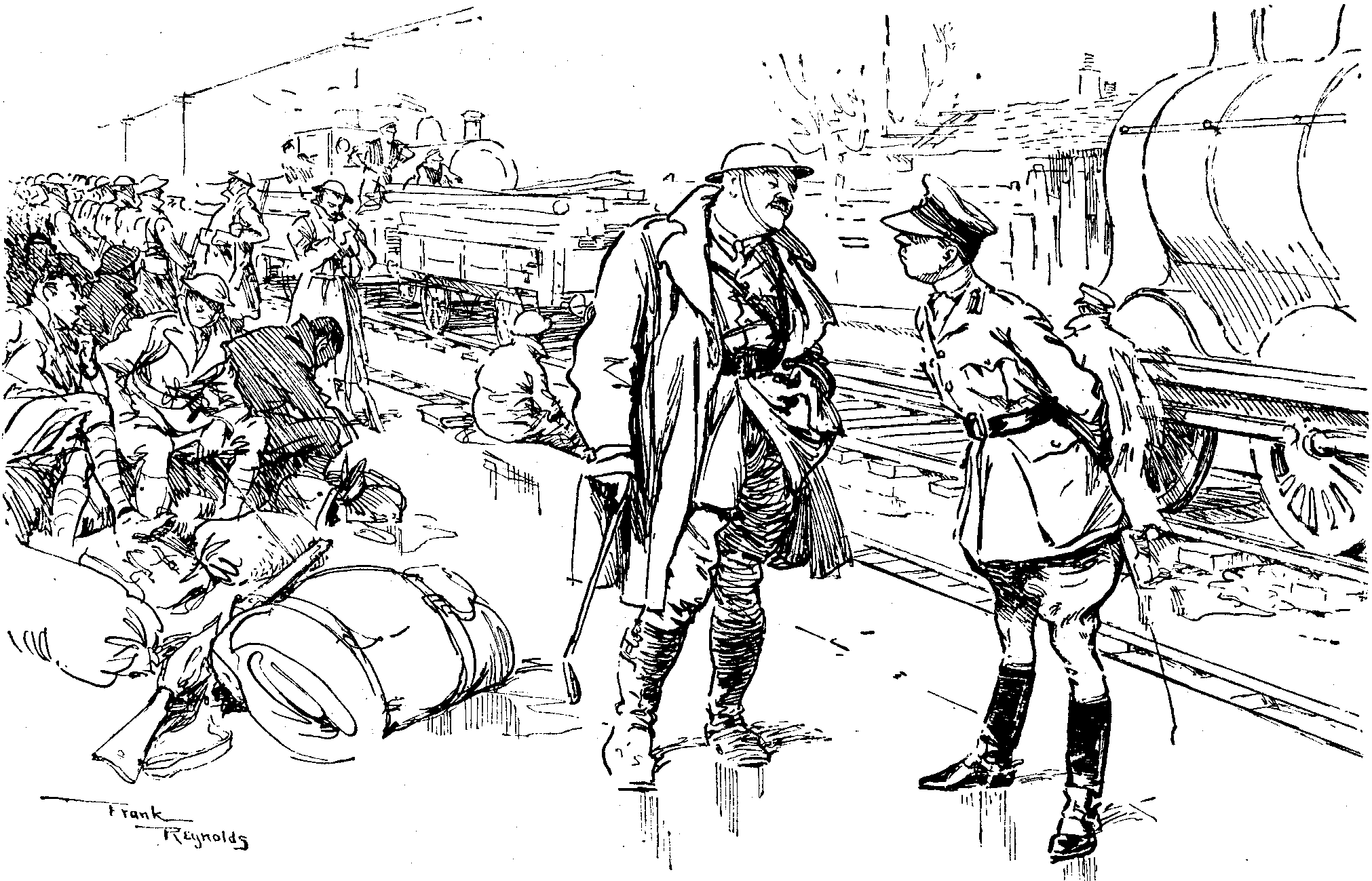 Colonel (back with his battalion from front lines—to horsey and immaculate Railway Transport, Officer). "ENGINES A BIT FRISKY THIS MORNING?"