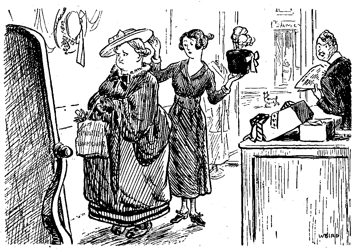 "We have a large range of all the daintiest materials. I believe our charmeuse, ninons and crêpe-de-Chines to be unrivalled in town, Sir. A little damp under foot to-day, Sir, but warmer, I think—distinctly warmer. Yes, Sir. Thank you, Sir, Good day, Sir."