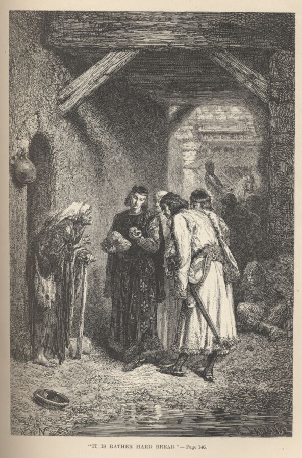 The king was surrounded by assailants, of whom some did and some did not know him, and all of whom kept shouting, “Yield you! yield you! else you die.” The banner of France fell at his side; for Geoffrey de Charny was slain. Denis de Morbecque, a knight of St. Omer, made his way up to the king, and said to him, in good French, “Sir, sir, I pray you, yield!” “To whom shall I yield me?” said John: “where is my cousin, the Prince of Wales?” “Sir, yield you to me; I will bring you to him.” “Who are you?” “Denis de Morbecque, a knight of Artois; I serve the King of England, not being able to live in the kingdom of France, for I have lost all I possessed there.” “I yield me to you,” said John: and he gave his glove to the knight, who led him away “in the midst of a great press, for every one was dragging the king, saying, ‘I took him!’ and he could not get forward, nor could my lord Philip, his young son. . . . The king said to them all, Sirs, conduct me courteously, and quarrel no more together about the taking of me, for I am rich and great enough to make every one of you rich.’” Hereupon, the two English marshals, the Earl of Warwick and the Earl of Suffolk, “seeing from afar this throng, gave spur to their steeds, and came up, asking, ‘What is this yonder?’ And answer was made to them, ‘It is the King of France who is taken, and more than ten knights and squires would fain have him.’ Then the two barons broke through the throng by dint of their horses, dismounted and bowed full low before the king, who was very joyful at their coming, for they saved him from great danger.” A very little while afterwards, the two marshals “entered the pavilion of the Prince of Wales, and made him a present of the King of France; the which present the prince could not but take kindly as a great and noble one, and so truly he did, for he bowed full low before the king, and received him as king, properly and discreetly, as he well knew how to do. . . . When evening came, the Prince of Wales gave a supper to the King of France, and to my lord Philip, his son, and to the greater part of the barons of France, who were prisoners. . . . And the prince would not sit at the king’s table for all the king’s entreaty, but waited as a serving-man at the king’s table, bending the knee before him, and saying, ‘Dear sir, be pleased not to put on so sad a countenance because it hath not pleased God to consent this day to your wishes, for assuredly my lord and father will show you all the honor and friendship he shall be able, and he will come to terms with you so reasonably that ye shall remain good friends forever.”