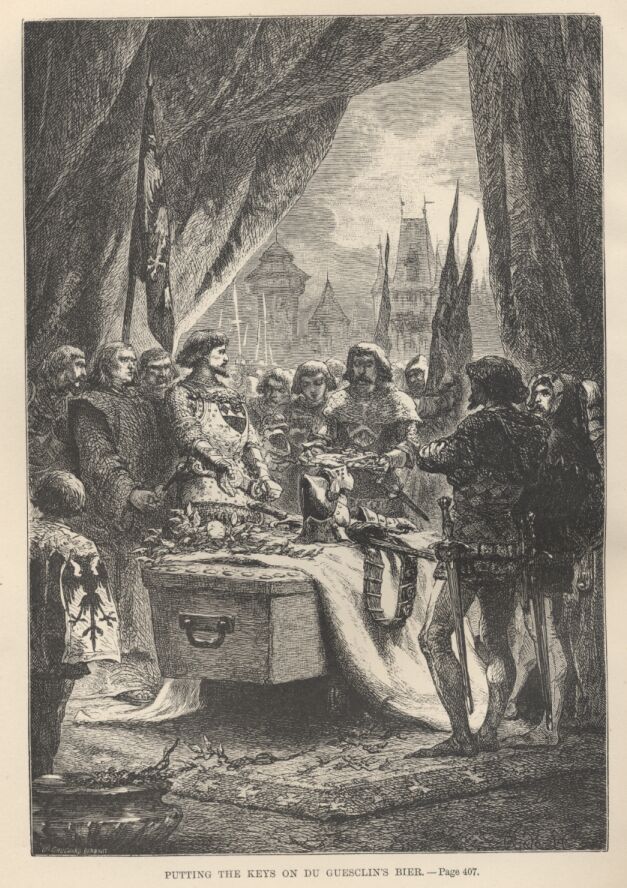 This dramatic story is not sufficiently supported by authentic documents to be admitted as an historical fact; but there is to be found in an old chronicle concerning Du Guesclin [published for the first time at the end of the fifteenth century, and in a new edition by M. Francisque Michel in 1830] a story which, in spite of many discrepancies, confirms the principal fact of the keys of Chateauneuf-Randon being brought by the garrison to the bier. “At the decease of Sir Bertrand,” says the chronicler, “a great cry arose throughout the host of the French. The English refused to give up the castle. The marshal, Louis de Sancerre, had the hostages brought to the ditches, for to have their heads struck off. But forthwith the people in the castle lowered their bridge, and the captain came and offered the keys to the marshal, who refused them, and said to him, ‘Friends, you have your agreements with Sir Bertrand, and ye shall fulfil them to him.’ ‘God the Lord!’ said the captain, ‘you know well that Sir Bertrand, who was so much worth, is dead: how, then, should we surrender to him this castle? Verily, lord marshal, you do demand our dishonor when you would have us and our castle surrendered to a dead knight.’ ‘Needs no parley hereupon,’ said the marshal, ‘but do it at once, for, if you put forth more words, short will be the life of your hostages.’ Well did the English see that it could not be otherwise; so they went forth all of them from the castle, their captain in front of them, and came to the marshal, who led them to the hostel where lay Sir Bertrand, and made them give up the keys and place them on his bier, sobbing the while: ‘Let all know that there was there nor knight, nor squire, French or English, who showed not great mourning.’”