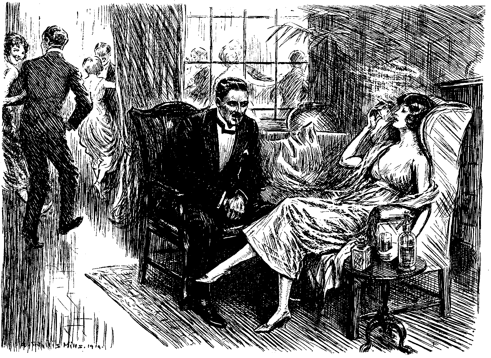A little later he recognised me and smiled. I examined his programme and found that he was engaged for the next dance to a girl who could talk to anyone on any subject; I could see my wife's hand in the arrangement. I explained the situation, piloted him to his partner and stayed with them a while. She made several openings for him in the conversation, which he immediately sealed up with monosyllables, and when she allowed her fan to slip to the floor he stepped on it. She suggested that they should take the air on the balcony, and as I left them he pulled himself together and began to tell her, in a well-modulated voice, that the surface of the floor was excellent.