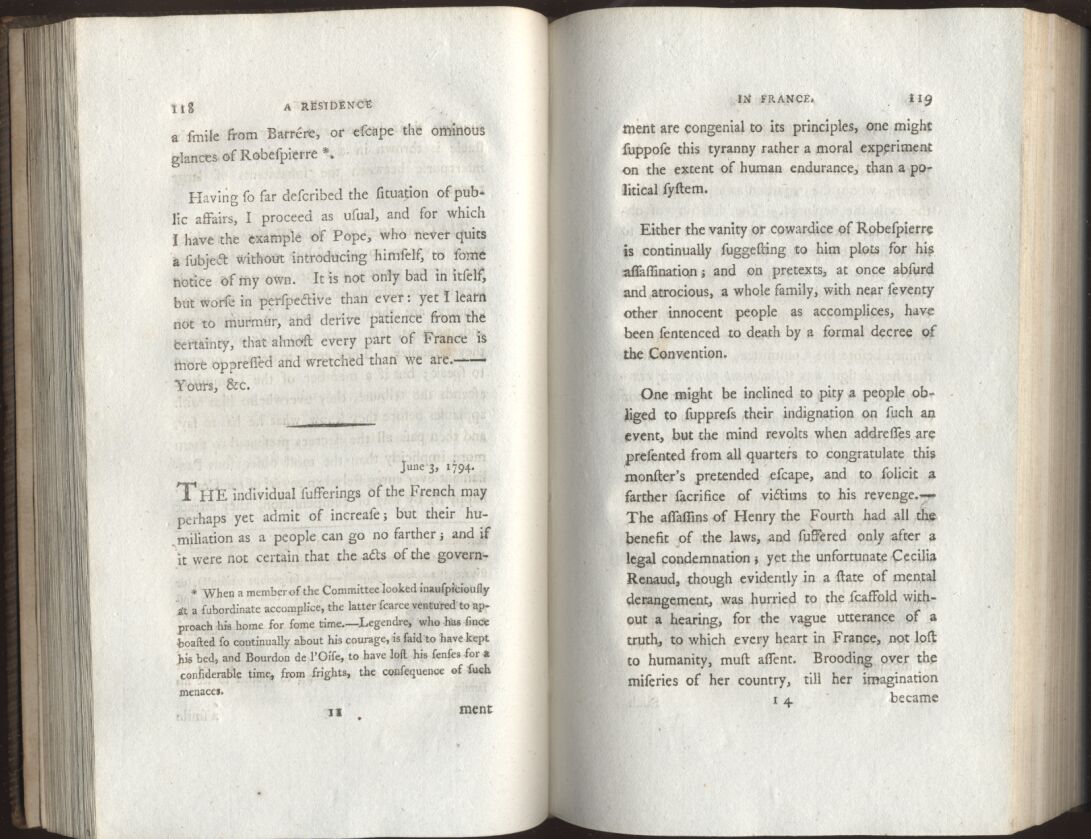 "—I know not if we are yet arrived at the climax of woe and iniquity, but Brissot, Condorcet, Rolland, &c. and all those whose principles you have reprobated as violent and dangerous, will now form the moderate side of the Assembly. Perhaps even those who are now the party most dreaded, may one day give place to yet more desperate leaders, and become in their turn our best alternative. What will then be the situation of France? Who can reflect without trembling at the prospect?—It is not yet safe to walk the streets decently dressed; and I have been obliged to supply myself with trowsers, a jacket, coloured neckcloths, and coarse linen, which I take care to soil before I venture out.