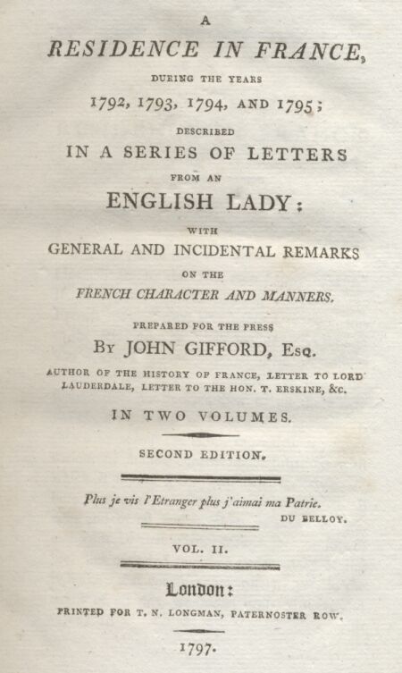 I avail myself of the opportunity afforded me by the publication of a Second Edition to notice some insinuations which have been thrown out, tending to question the authenticity of the work. The motives which have induced the author to withhold from these Letters the sanction of her name, relate not to herself, but to some friends still remaining in France, whose safety she justly conceives might be affected by the disclosure. Acceding to the force and propriety of these motives, yet aware of the suspicions to which a recital of important facts, by an anonymous writer, would naturally be exposed, and sensible, also, that a certain description of critics would gladly avail themselves of any opportunity for discouraging the circulation of a work which contained principles hostile to their own; I determined to prefix my name to the publication. By so doing, I conceived that I stood pledged for its authenticity; and the matter has certainly been put in a proper light by an able and respectable critic, who has observed that "Mr. GIFFORD stands between the writer and the public," and that "his name and character are the guarantees for the authenticity of the Letters."