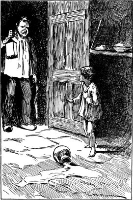 Again the croaking creature stood and gloated over his victim, then left him to the silence of another long day in the dungeon. The third day he opened the door and hopped in, rubbing his webbed hands together with fiendish pleasure, saying, "You are to have no food and drink to-night, for the Witch has thought of a far more horrible punishment for you. In the morning I shall surely come again, and then--beware!"